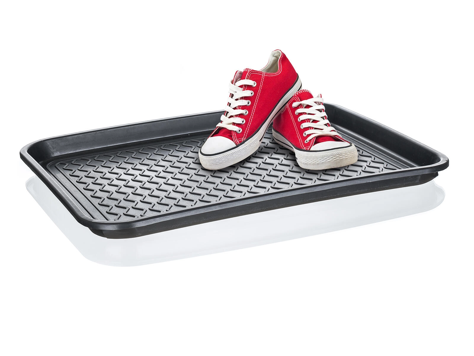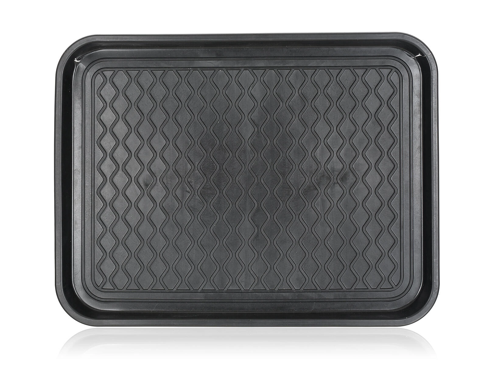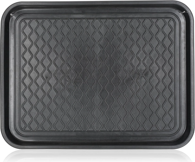 Praktische schoenafdruipmat met afmetingen 50 × 38 cm, gemaakt van duurzaam recyclebaar plastic in een elegante zwarte kleur. Vangt betrouwbaar water, sneeuw en vuil van schoenen op en houdt uw vloer schoon – ideaal voor de hal en in de kofferbak van de auto.