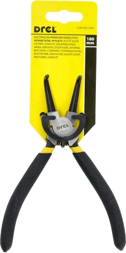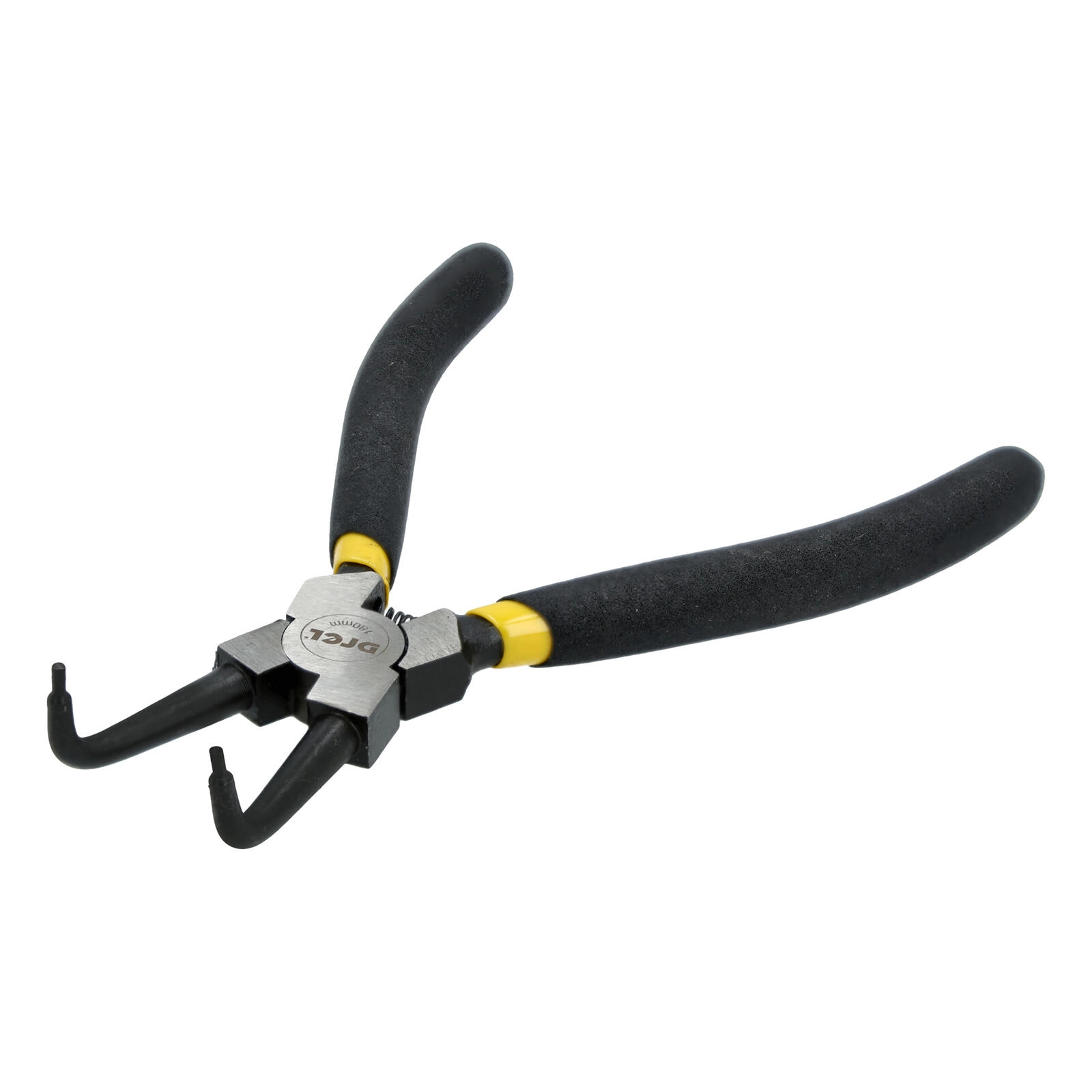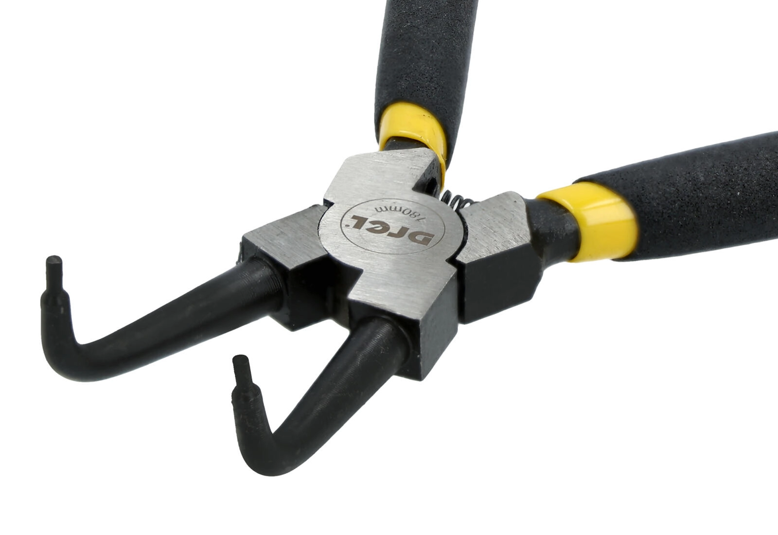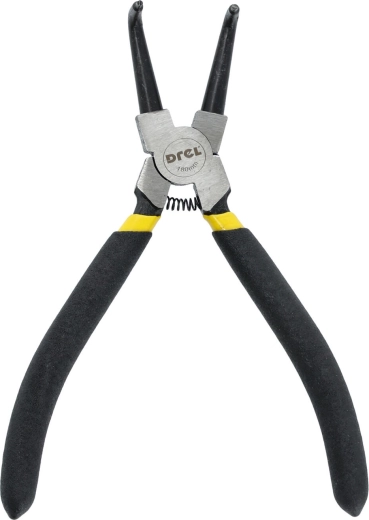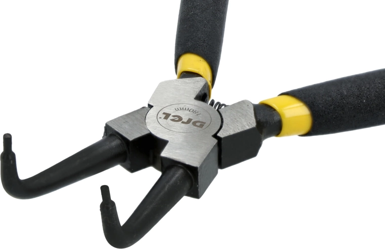 Deze interne Seegerringtang van DREL met gebogen uiteinden maakt het hanteren van borgringen in boringen en lagerschalen eenvoudiger. Dankzij de ergonomische handgrepen met antislipoppervlak en veerassistentie voert u precies werk uit, zelfs op krappe plaatsen, zonder extra moeite.