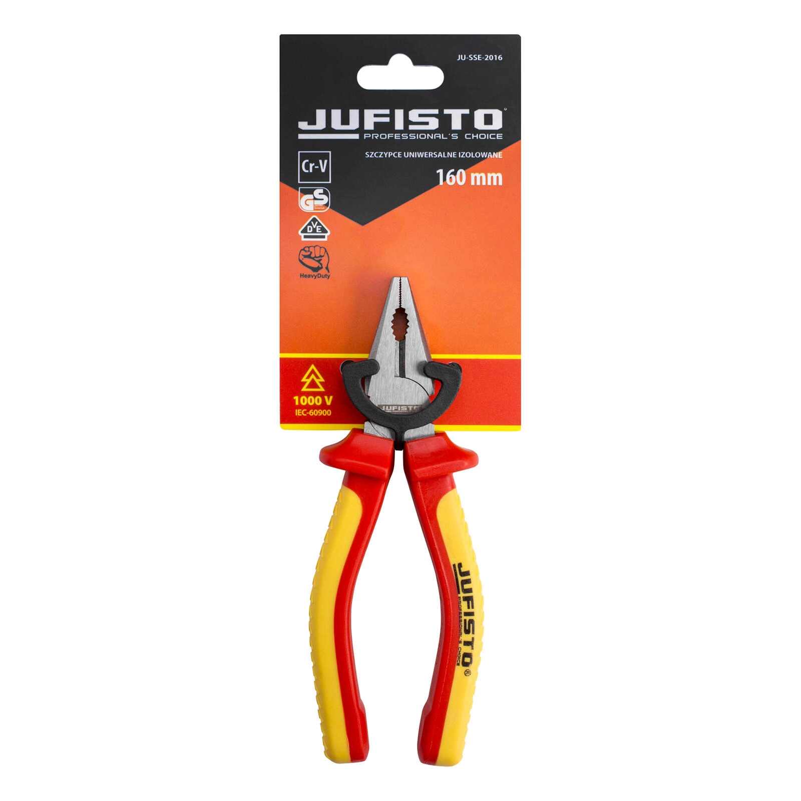 Professionele combinatietang van 160 mm met VDE/GS-certificering voor werkzaamheden tot 1000 V. Voorzien van harde en precieze snijkanten 58–62 HRC, een duurzame chroom-vanadiumstalen body 60CrV en een comfortabele tweekleurige TPE-handgreep geschikt voor veeleisende omstandigheden.