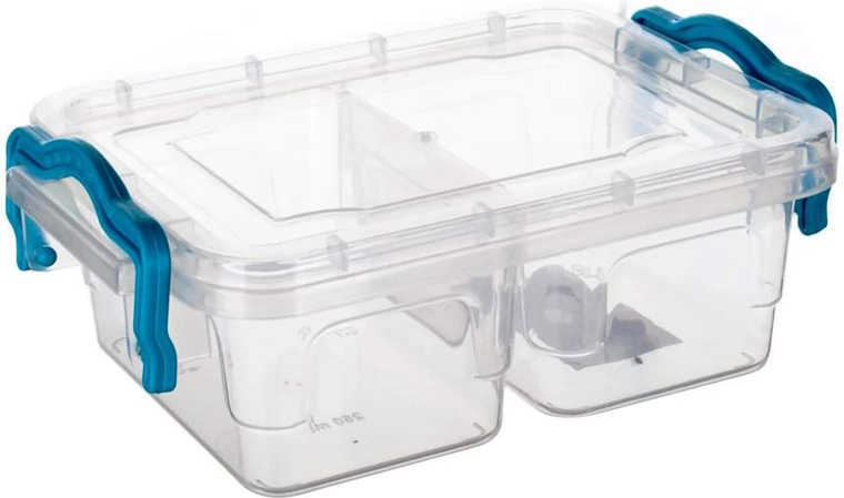 Praktische verdeelde Gema-doos met een inhoud van 2×250 ml, voorzien van twee overzichtelijke vakken in transparante uitvoering en comfortabele turkooise handgrepen voor eenvoudige hantering. Geschikt voor de magnetron tot 95 °C en de vriezer tot −25 °C – ideaal voor bewaren, meenemen en opwarmen van kleinere porties.