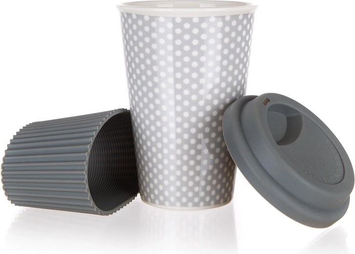 Stijlvolle reisbeker van 400 ml in elegante grijze kleur, ideaal voor je dagelijkse koffie of thee. Voorzien van een siliconen deksel tegen morsen en een geribde siliconen huls voor een veilige grip en bescherming tegen warmte. Het keramische lichaam houdt de temperatuur uitstekend vast en is geschikt voor magnetron en vaatwasser.