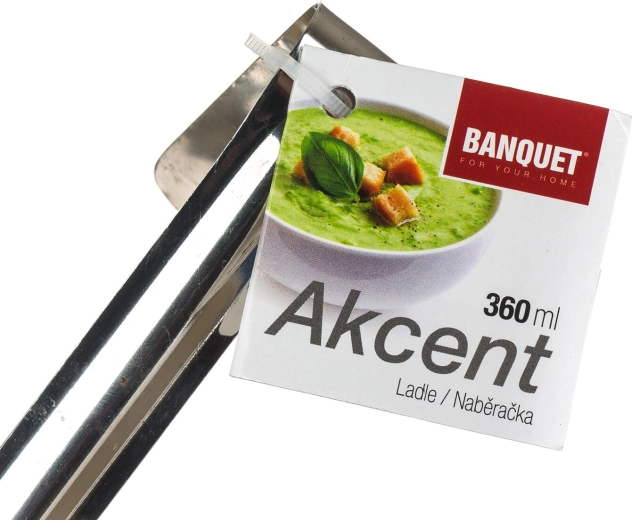 Praktische RVS soeplepel AKCENT met een diameter van 12 cm en een inhoud van 360 ml voor comfortabel serveren van soepen en sauzen. Heeft een haak om op te hangen, is geschikt voor de vaatwasser en dankzij de hoogwaardige roestvrijstalen uitvoering bestand tegen dagelijks gebruik.