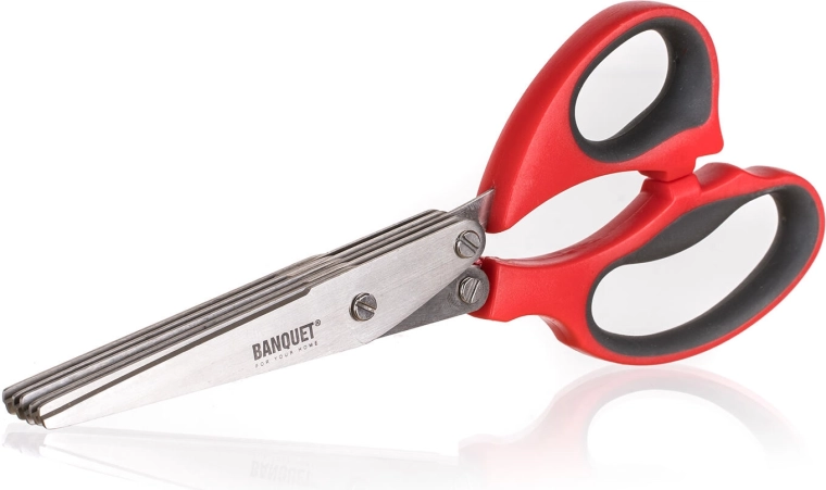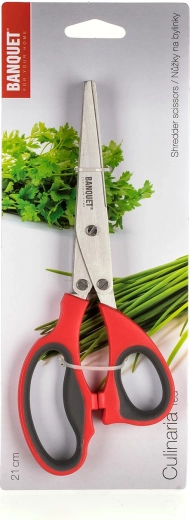 Praktische Culinaria-kruidenschaar van 21 cm vereenvoudigt het koken dankzij meerdere parallelle bladen die zorgen voor snel en gelijkmatig knippen. Comfortabele ergonomische handgrepen van duurzaam kunststof in rode kleur bieden een zekere grip en eenvoudig gebruik direct boven het bord of in de kom.