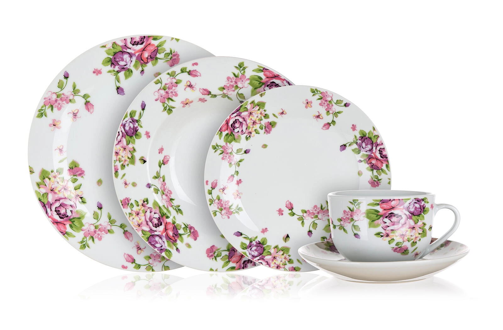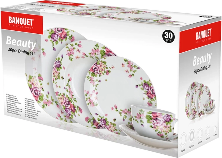 De set bevat 30 delen: 6 diepe, 6 platte en 6 dessertborden, 6 schoteltjes en 6 kopjes met een inhoud van 220 ml – ideaal voor zowel alledaags als feestelijk dineren.