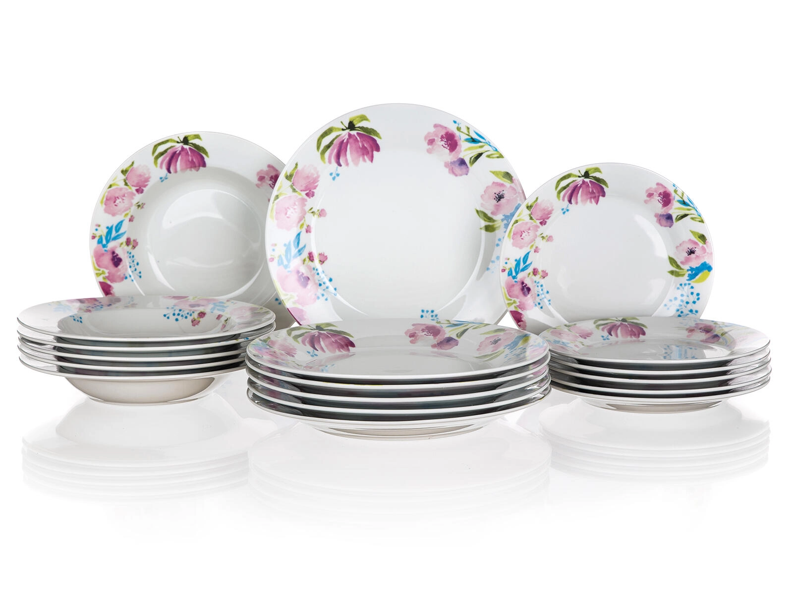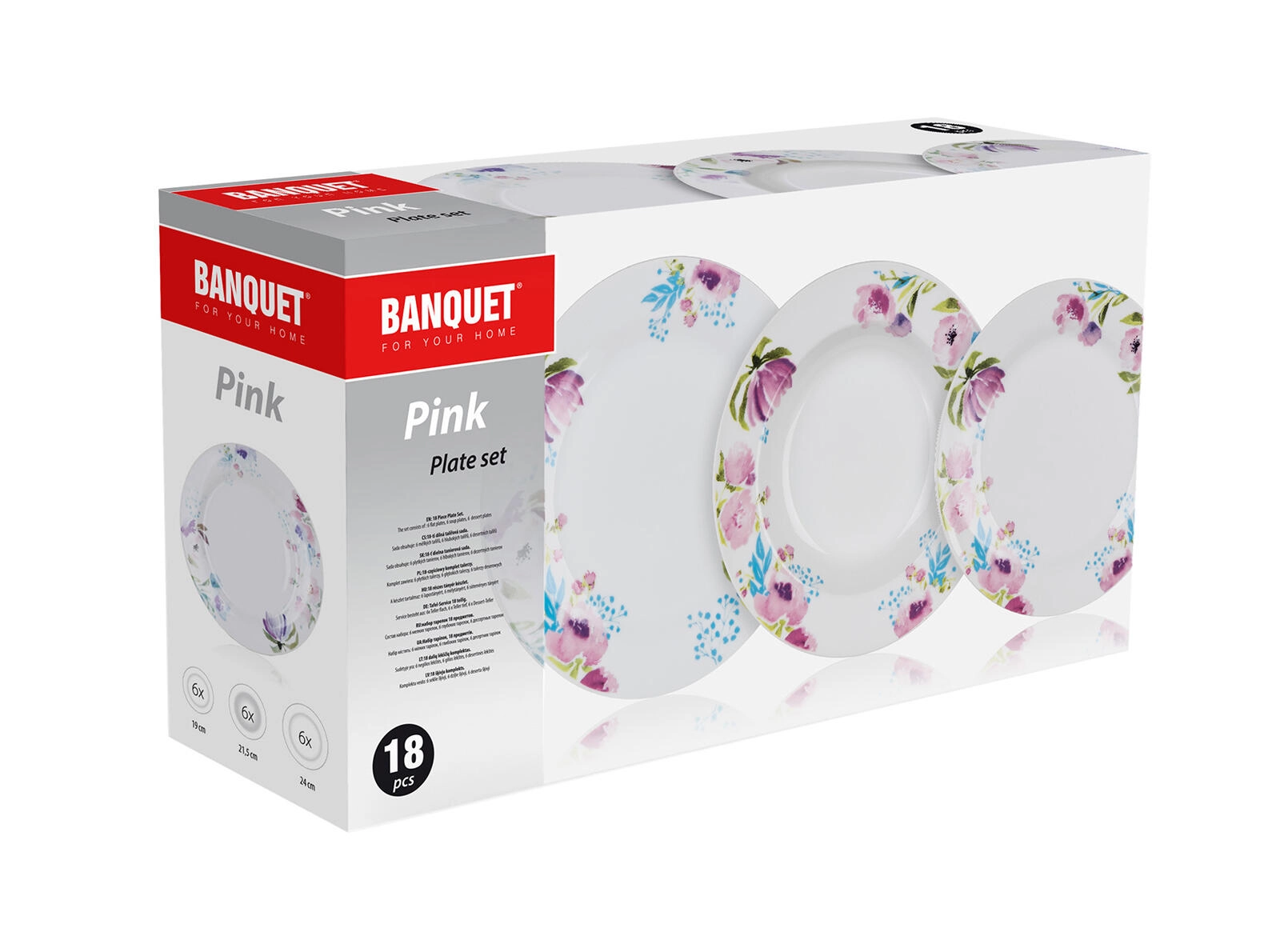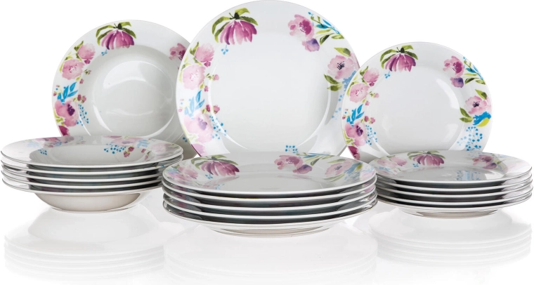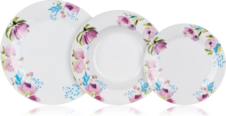 Elegante 18-delige porseleinen dinerset met een subtiel bloemendecor Pink Flowers die elke tafel verfraait. Bevat dessert-, diepe en platte borden voor complete bediening. De borden zijn geschikt voor de magnetron en vaatwasserbestendig, waardoor ze gemakkelijk te onderhouden zijn en dagelijks comfort bieden.