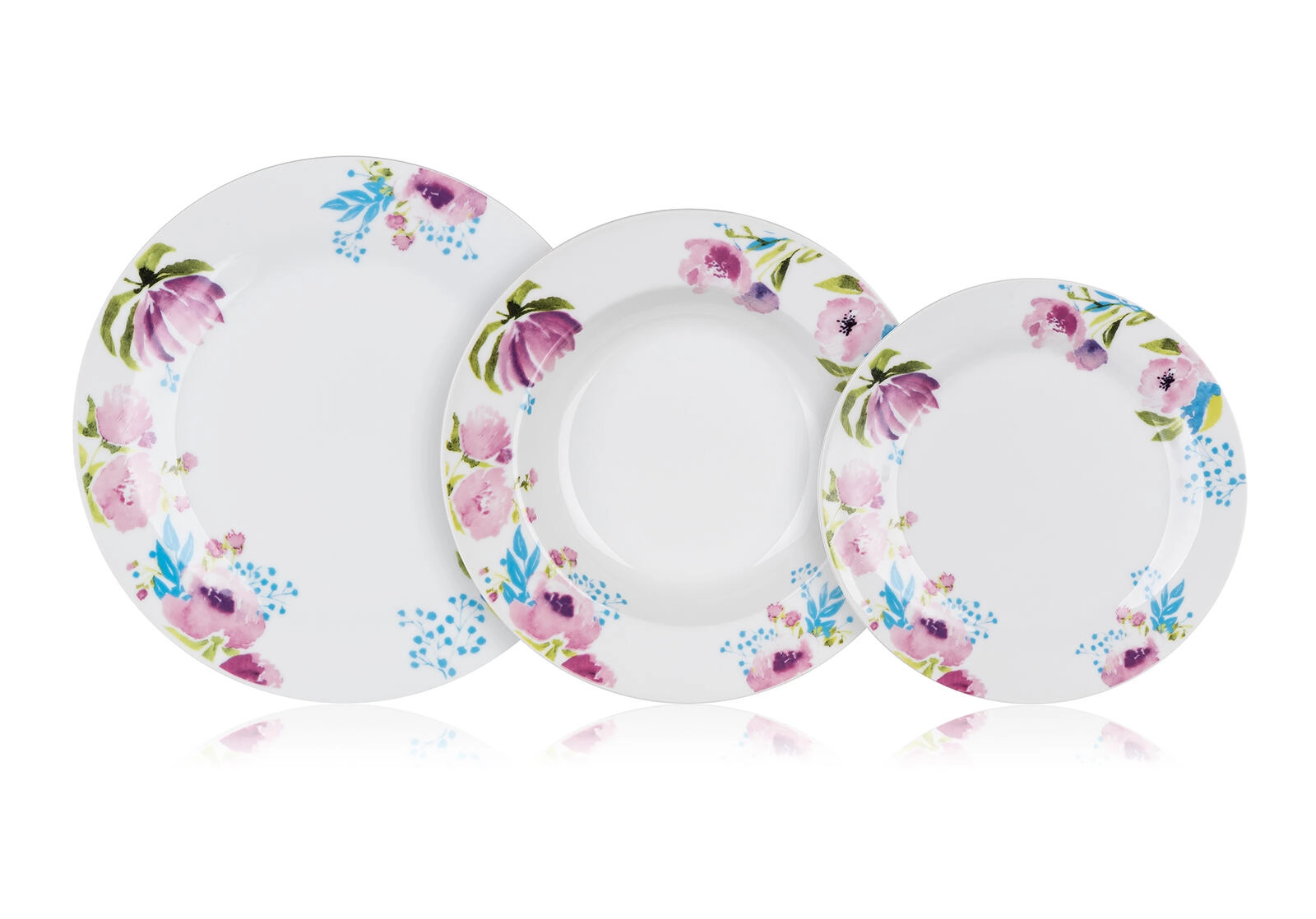 Subtiele roze, paarse en blauwe bloemen langs de rand geven het witte porselein een frisse uitstraling en zijn eenvoudig te combineren met ander servies en textiel.