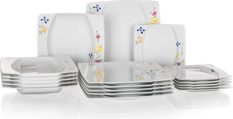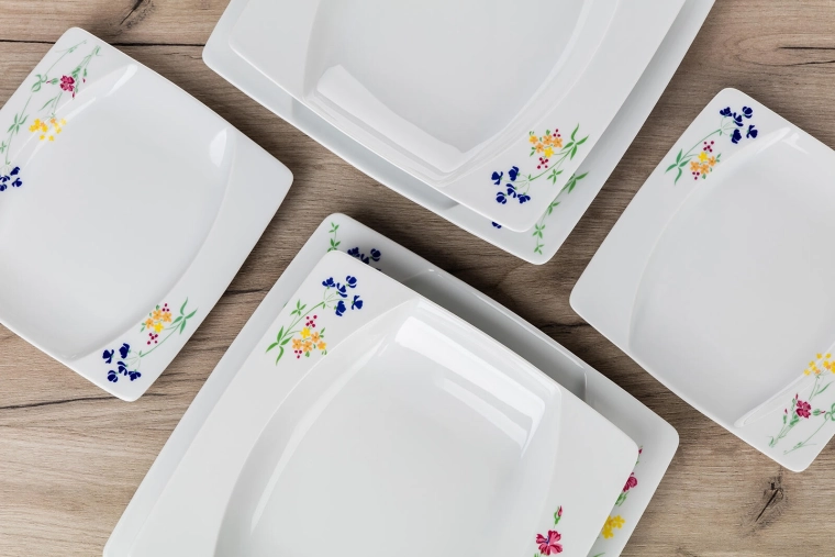 In de set vind je alles voor compleet serveren – van soepen en hoofdgerechten tot desserts. De vierkante vorm met licht verzonken midden helpt bij een elegante presentatie van gerechten en voorkomt het overlopen van sauzen.