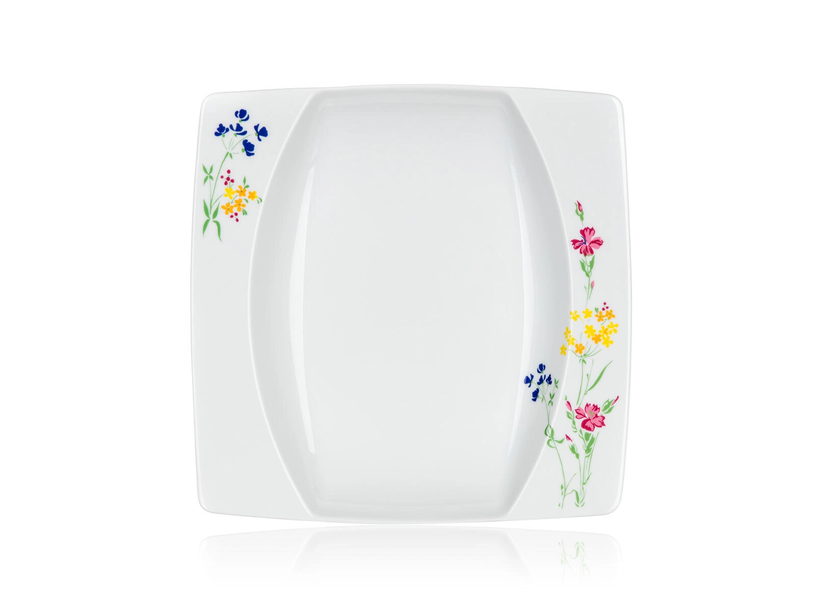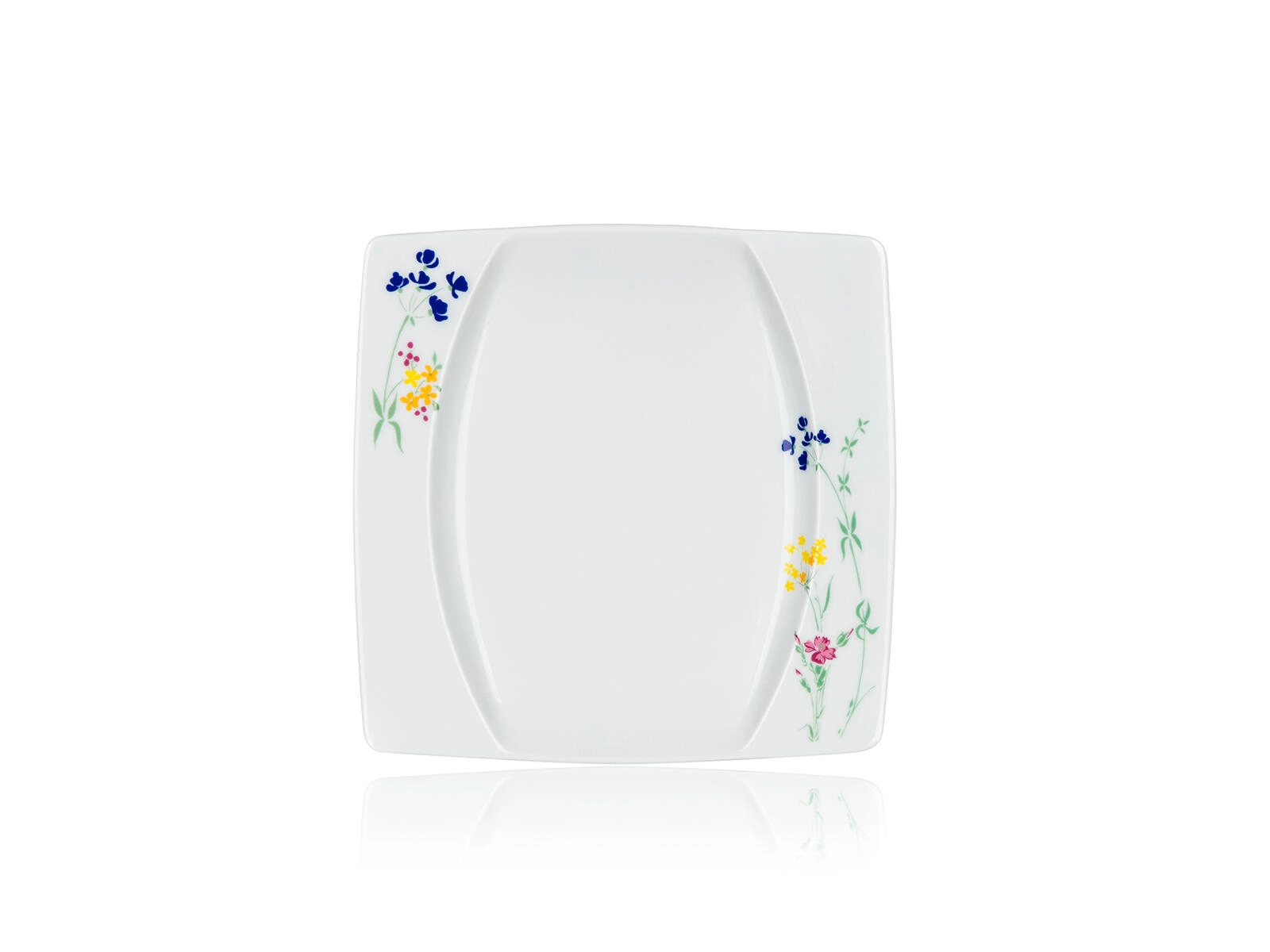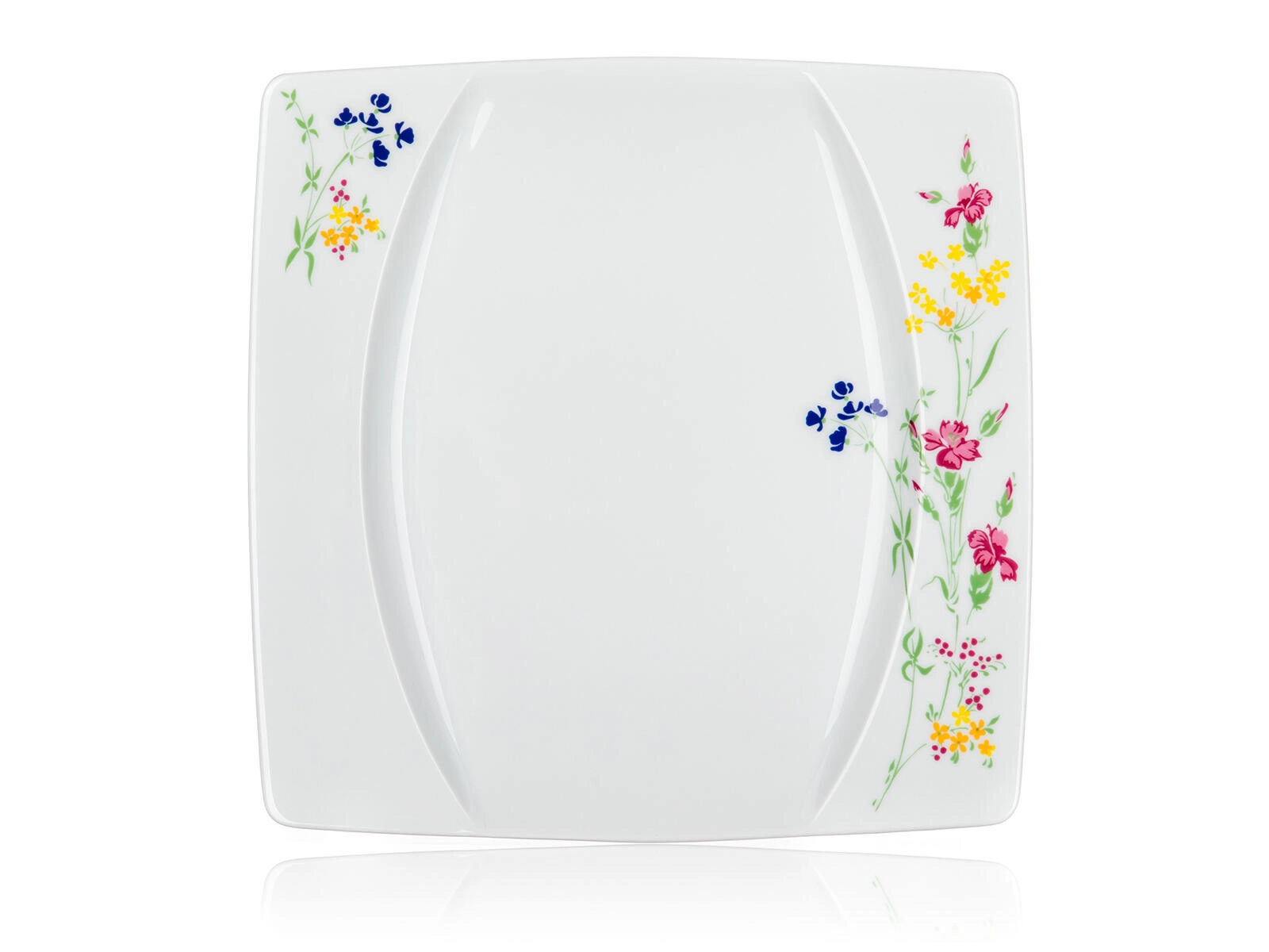 Stijlvolle vierkante borden met een subtiele bloemenprint in de hoeken geven de tafelsetting een eigen karakter en zijn eenvoudig te combineren met ander servies.