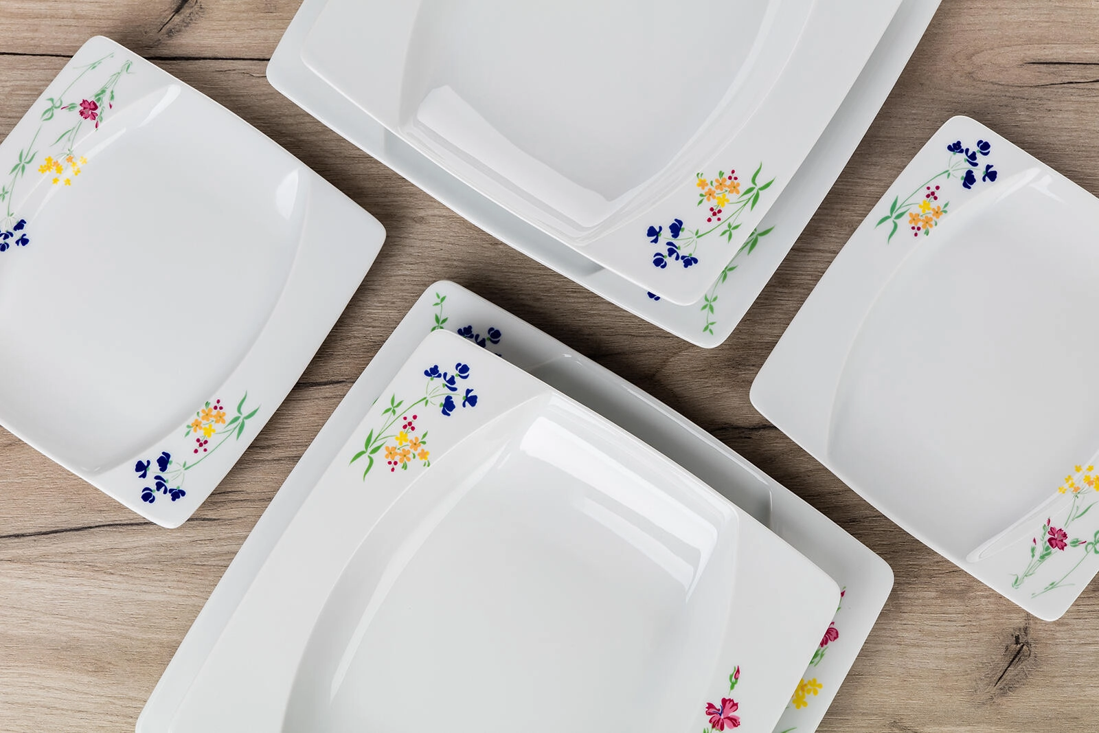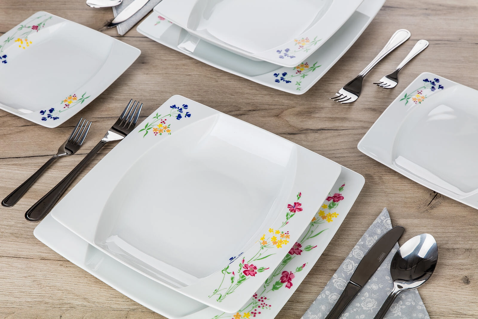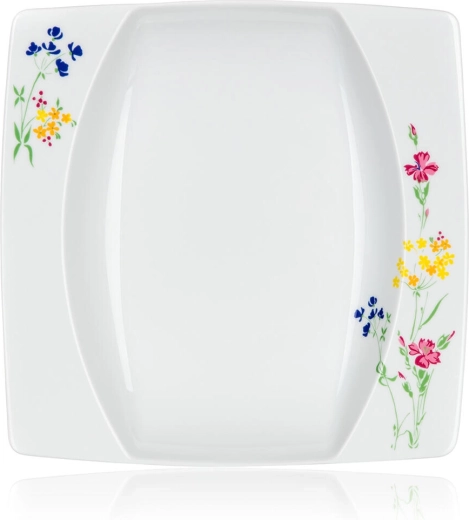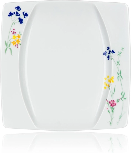 Stijlvolle vierkante borden met een subtiele bloemenprint in de hoeken geven de tafelsetting een eigen karakter en zijn eenvoudig te combineren met ander servies.
