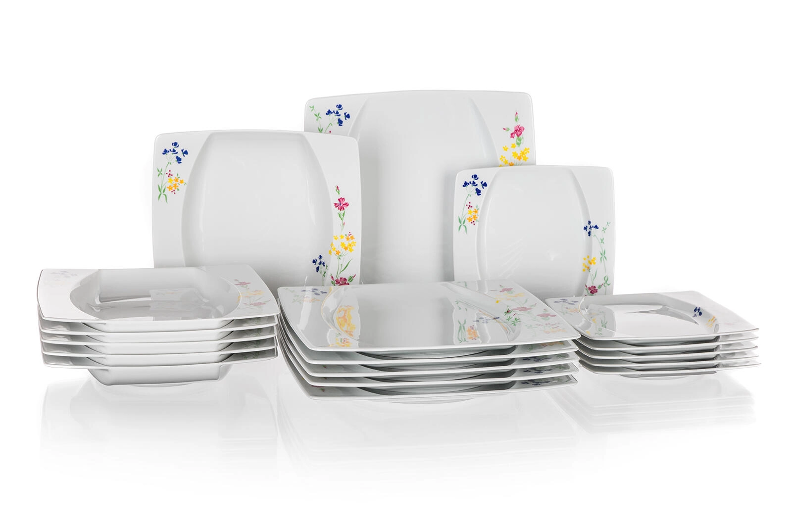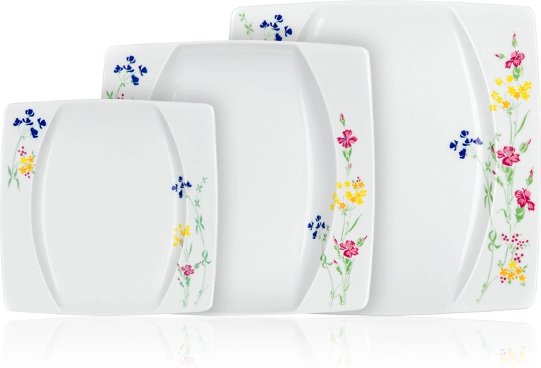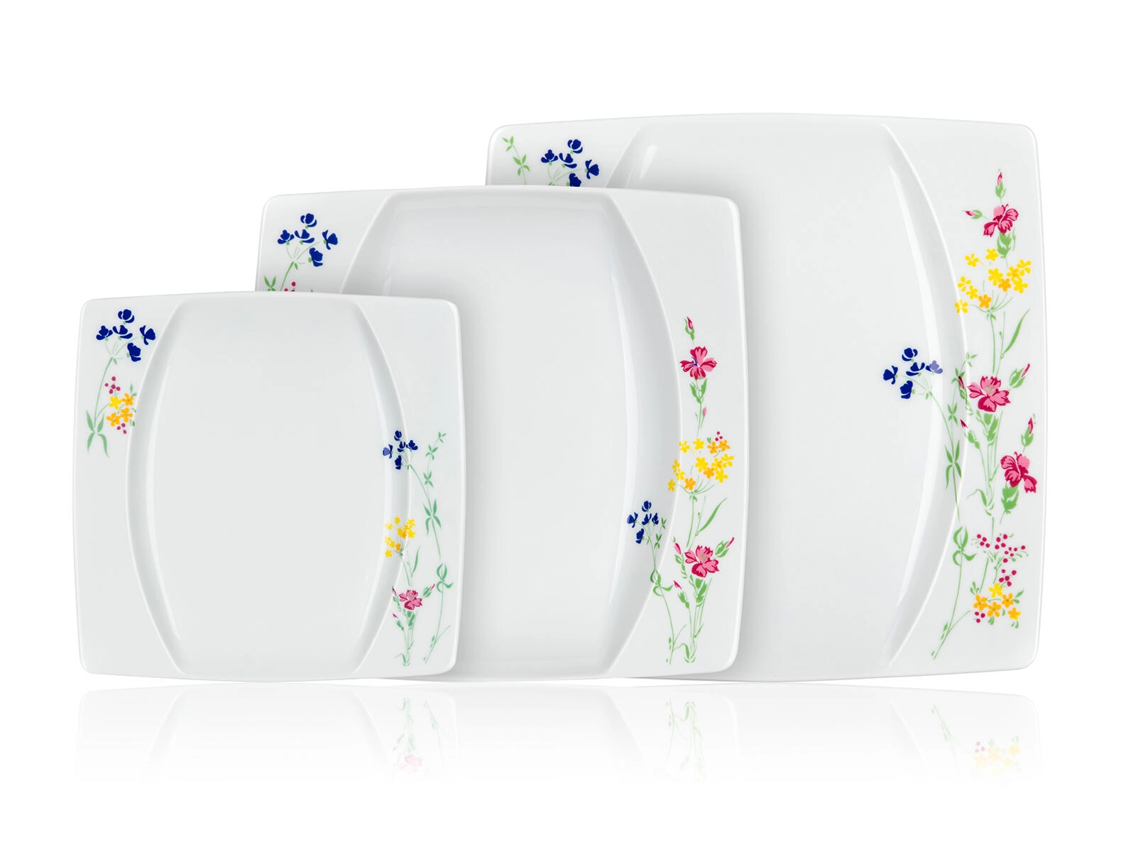 Deze tijdloze vierkante set combineert een elegant design met praktisch gebruik voor elke dag. Het subtiele bloemmotief op de randen en de glanzende glazuur benadrukken zowel feestelijke als alledaagse tafelmomenten. Dankzij het duurzame THUN-porselein zijn de borden makkelijk te onderhouden en behouden ze langdurig hun kleur en glans.