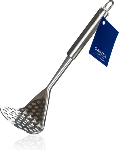 Praktische AZORA-aardappelstamper van hoogwaardig roestvrij staal voor het eenvoudig bereiden van zelfgemaakte puree en purées. Biedt duurzame uitvoering, eenvoudig onderhoud en gemakkelijk ophangen dankzij het oog. Geschikt voor professioneel en huishoudelijk gebruik, vaatwasserbestendig.