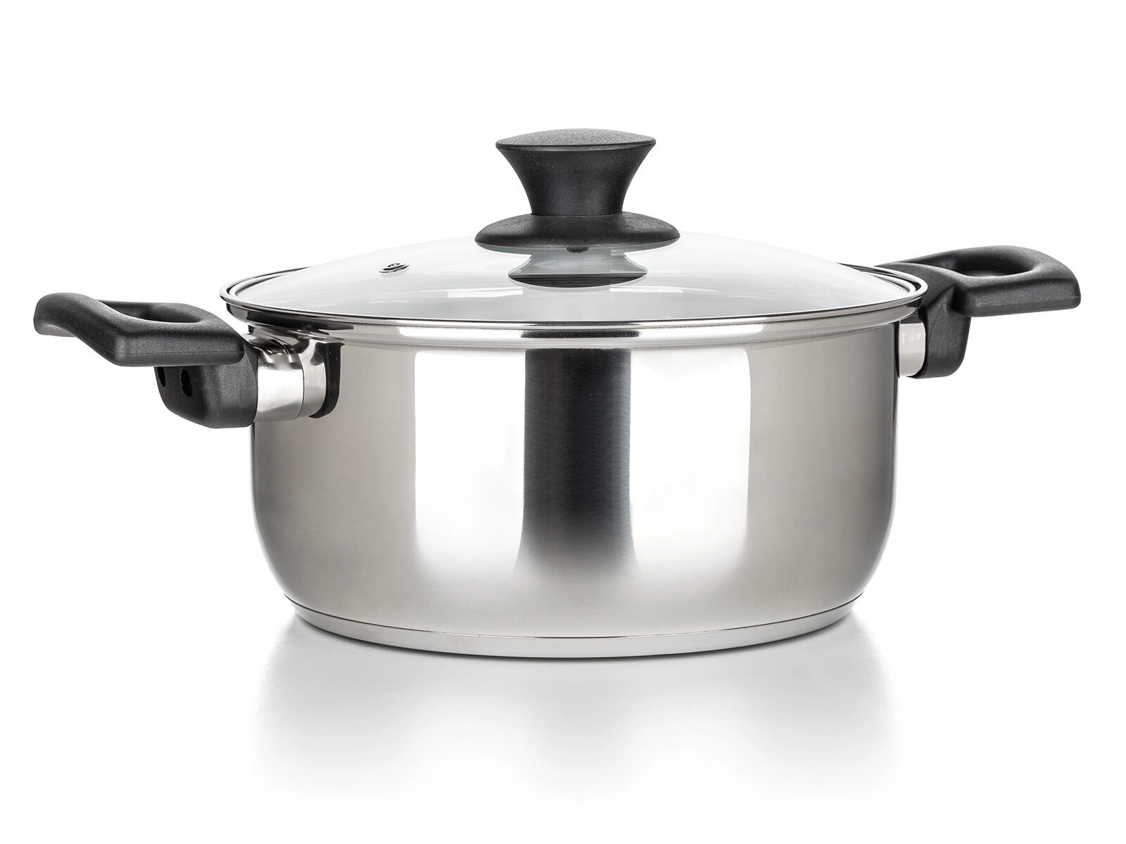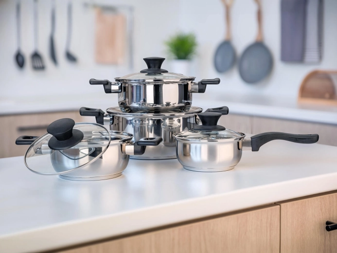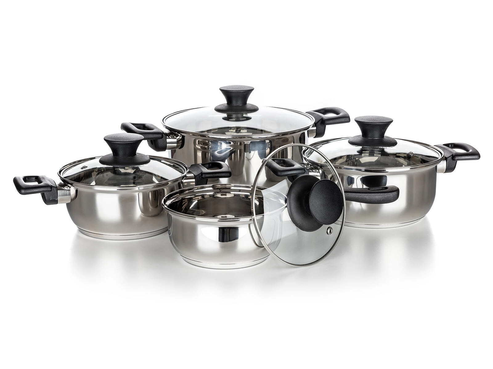 Complete 8-delige set roestvrijstalen kookgerei Super Value voor dagelijks koken. Duurzaam roestvrij staal met glanzende afwerking, gehard glazen deksels met stoomventiel en compatibel met alle soorten kookplaten, inclusief inductie. Eenvoudig onderhoud en vaatwasmachinebestendig.