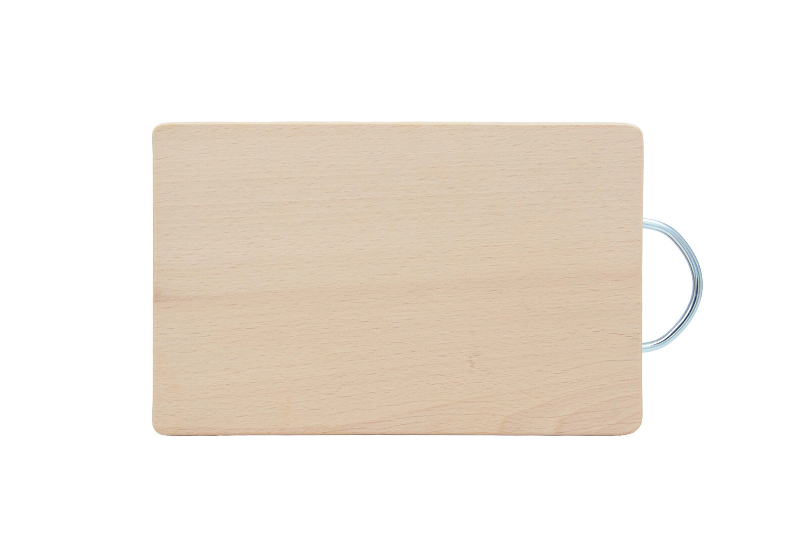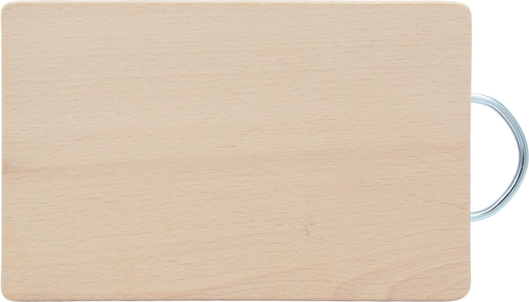 Praktische houten snijplank met een metalen handvat voor eenvoudig dragen en ophangen. Biedt dubbelzijdig gebruik, is gemaakt van hoogwaardig beukenhout en past dankzij de compacte afmetingen in elke keuken.