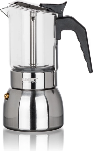 Ontdek thuis de bereiding van aromatische, sterke koffie met het mokapotje LENA. Het combineert roestvrij staal, transparant glas voor controle over de extractie en een veiligheidsventiel voor zorgeloos gebruik. Het compacte volume van 200 ml (tot 4 kopjes) is ideaal voor je dagelijkse ritueel. Geschikt voor gas, elektrisch, keramisch en inductie.