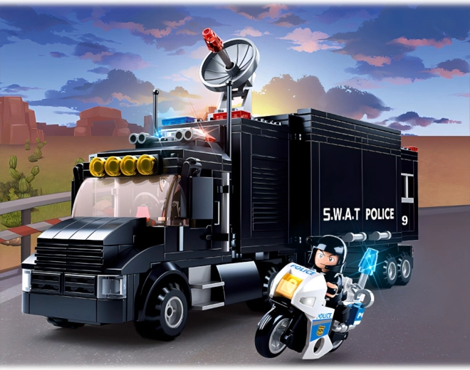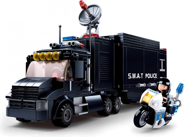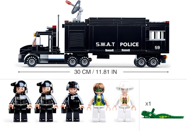Het middelpunt van de set is een zwarte SWAT-vrachtwagen – een mobiele commandopost met realistische details, die dient als hoofdkwartier voor alle politieacties. Ideaal voor tactische verplaatsingen en het plannen van inzetten.