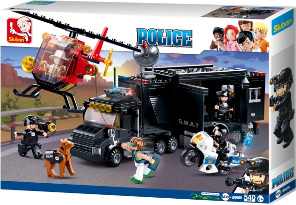 Bouw je eigen politie-actiewereld met de SLUBAN-bouwset, met een SWAT mobiele commandopost, helikopter, politiemotor en een set figuurtjes. Met 535 onderdelen en een gemiddelde moeilijkheidsgraad is het een ideale keuze voor kinderen vanaf 6 jaar, en dankzij de compatibiliteit met LEGO en andere merken breid je je collectie eenvoudig uit.
