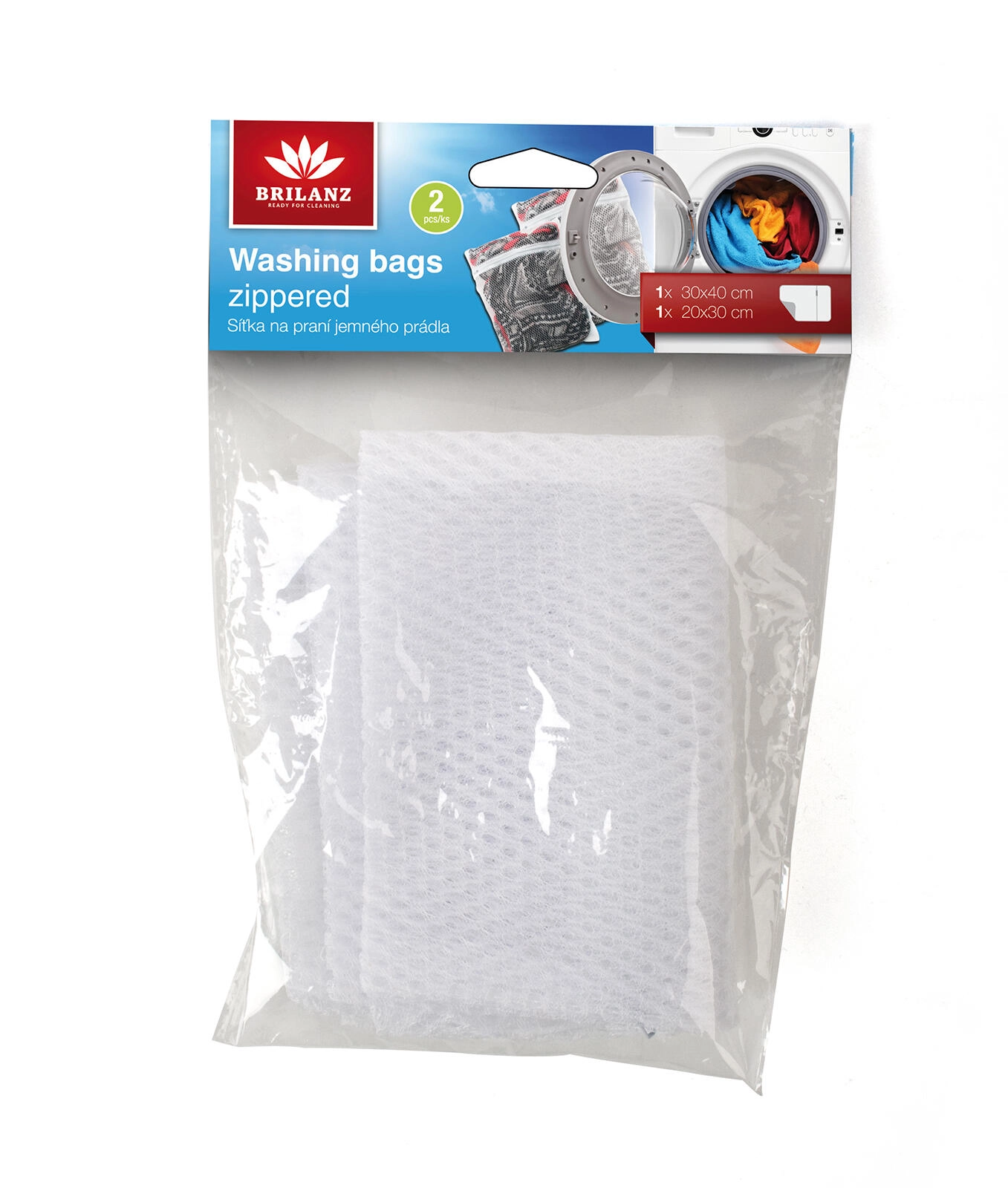 Praktische set van twee netstof waszakken BRILANZ beschermt delicate was tegen beschadiging. Dankzij het stevige net en de betrouwbare rits raakt uw was tijdens het wassen en centrifugeren niet in de knoop of trektjes. Fijne netstof, ritssluiting en twee universele maten voor eenvoudige bescherming van gordijnen, ondergoed en delicate textielsoorten.