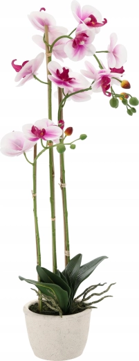 Deze elegante kunstorchidee in een zachte wit‑roze kleurstelling oogt zeer natuurlijk dankzij de fijn afgewerkte bloemen, knoppen en bladeren. De hoogte van 70 cm is ideaal voor vensterbanken, dressoirs of badkamers en brengt frisheid en stijl zonder behoefte aan licht of regelmatig onderhoud.