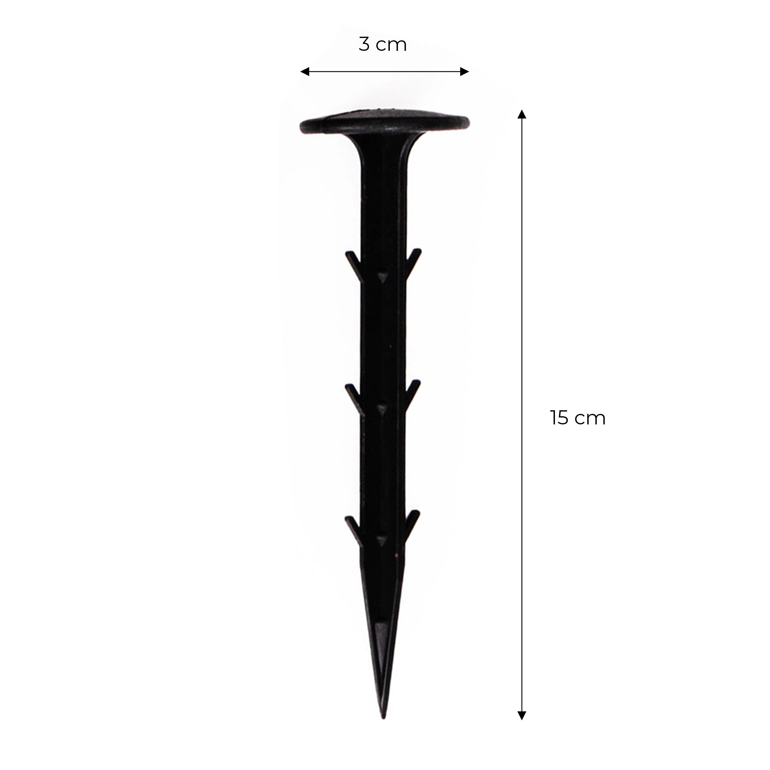 Praktische set grondpennen voor het bevestigen van tuintextielen en mulchmatten. Universeel toepasbaar, stevige fixatie tegen verschuiven en eenvoudige installatie dankzij de brede kop, scherpe punt en stabiliserende haakjes. Ideaal voor bloembedden, paden en gazonranden.