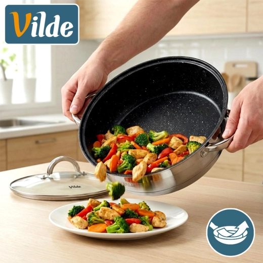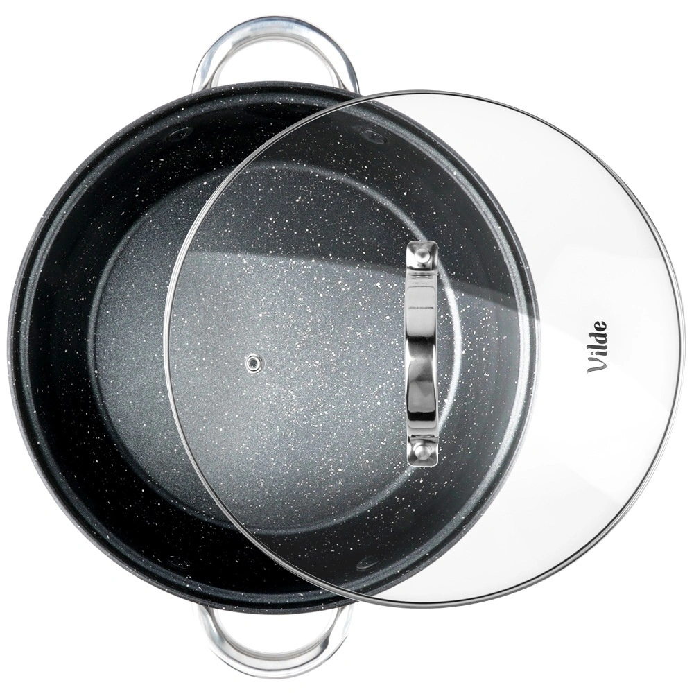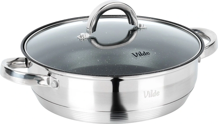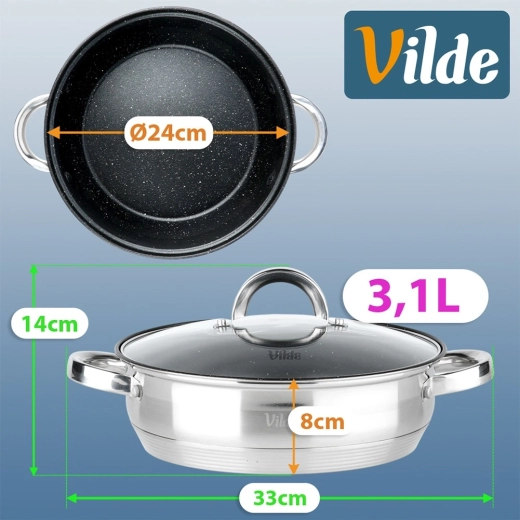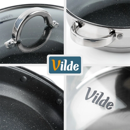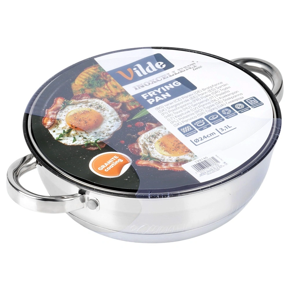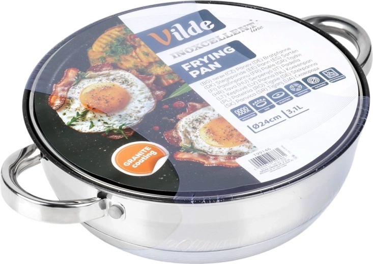 De binnenzijde van de pan is voorzien van een duurzame antiaanbaklaag met granietlook, de buitenzijde combineert mat en hoogglans afwerking. Het product voldoet aan Europese kwaliteitsnormen. Origineel product van het merk Vilde uit de INOXCELLENT-lijn.