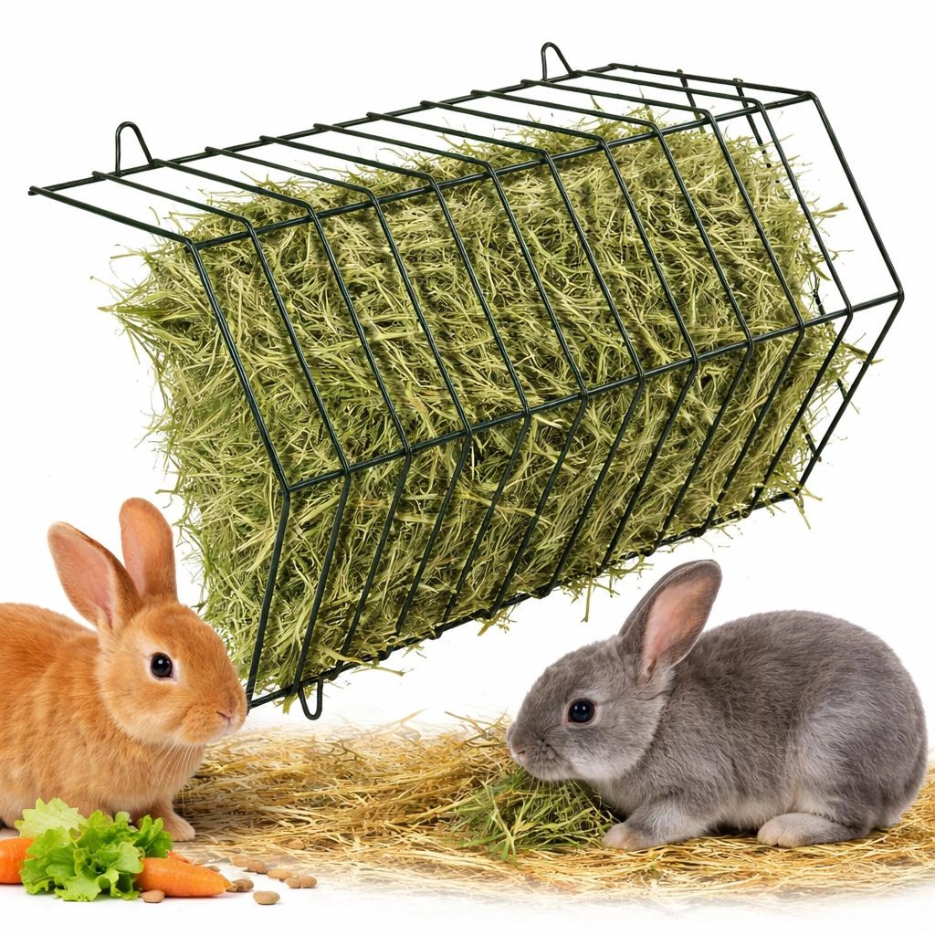 De installatie is snel en veelzijdig: 4 ophangogen maken een stevige bevestiging aan gaas of wand mogelijk en het ontwerp is geschikt voor links- en rechtszijdige plaatsing, zodat het past bij uw inrichting. De compacte afmetingen (30 × 26 × 10 cm) besparen ruimte en zorgen voor veilige opname van hooi zonder onnodige vervuiling van het hok.