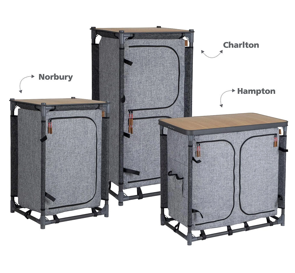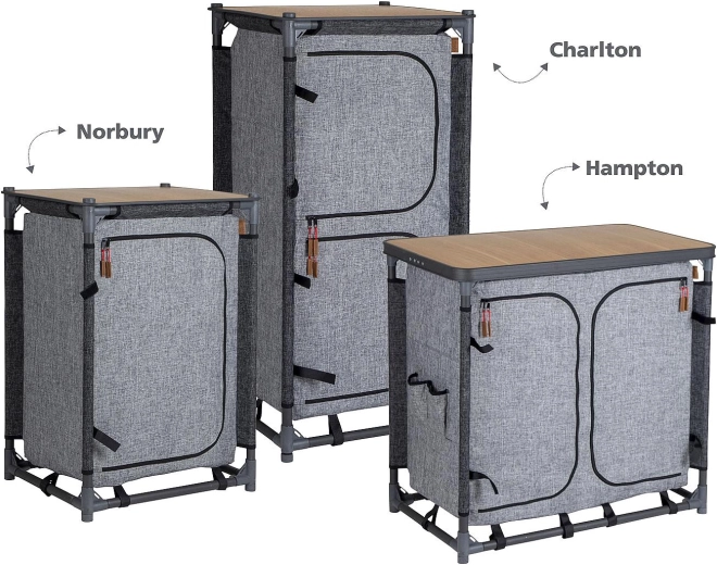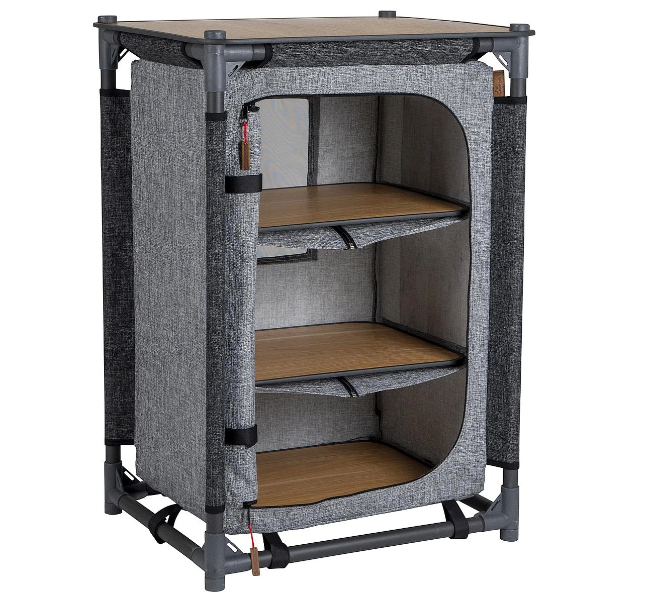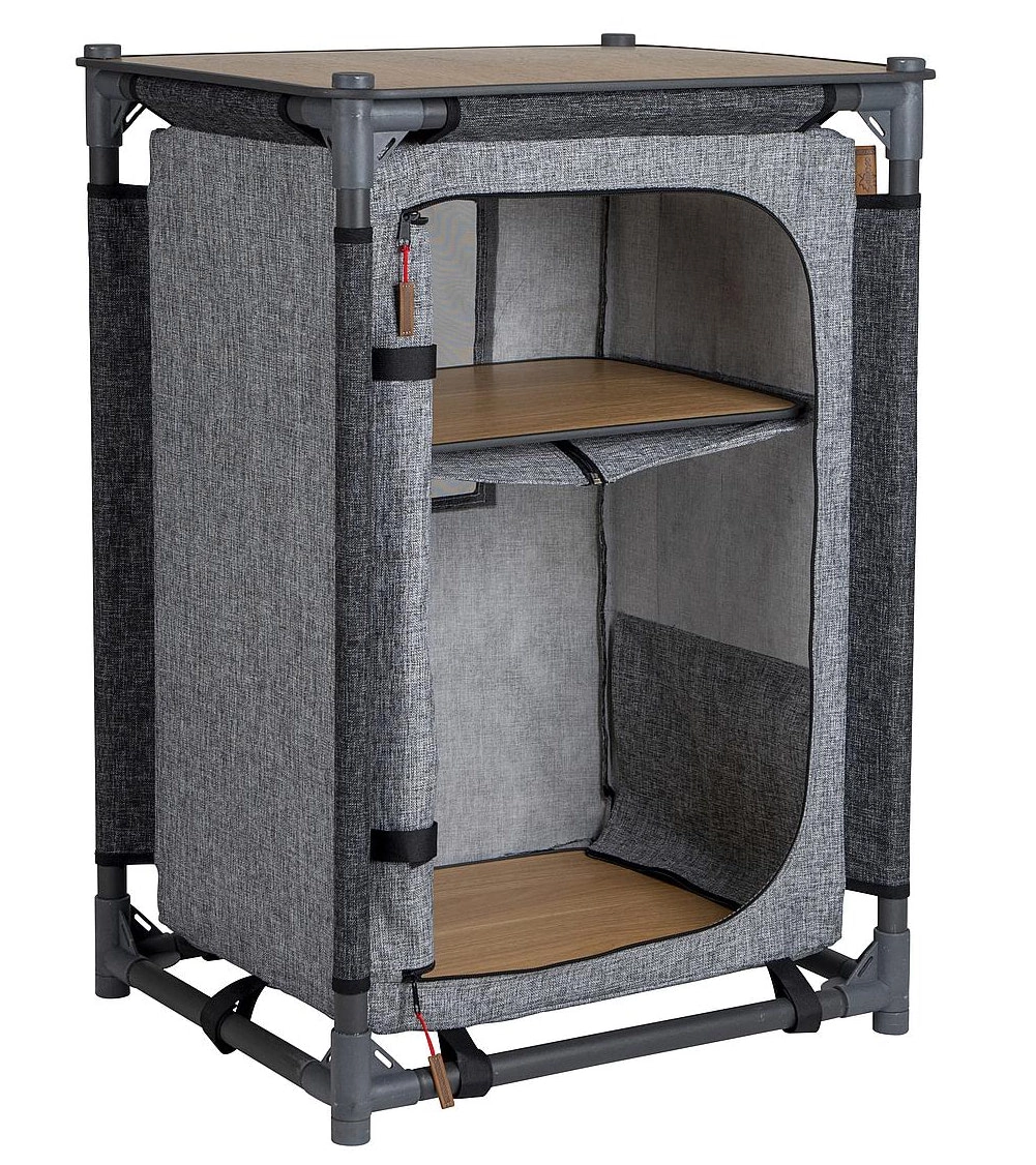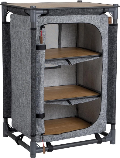 Praktische en stijlvolle kast voor kamperen en thuis, met voldoende opbergruimte, snel op te zetten en een stabiele constructie. Dankzij het aluminium frame, het duurzame MDF-blad met houtlook en de Oxford polyester bekleding is hij ideaal voor de camping, caravan en kleine woning. Verstelbare poten zorgen voor stabiliteit op oneffen terrein en de draagtas maakt transport eenvoudig.