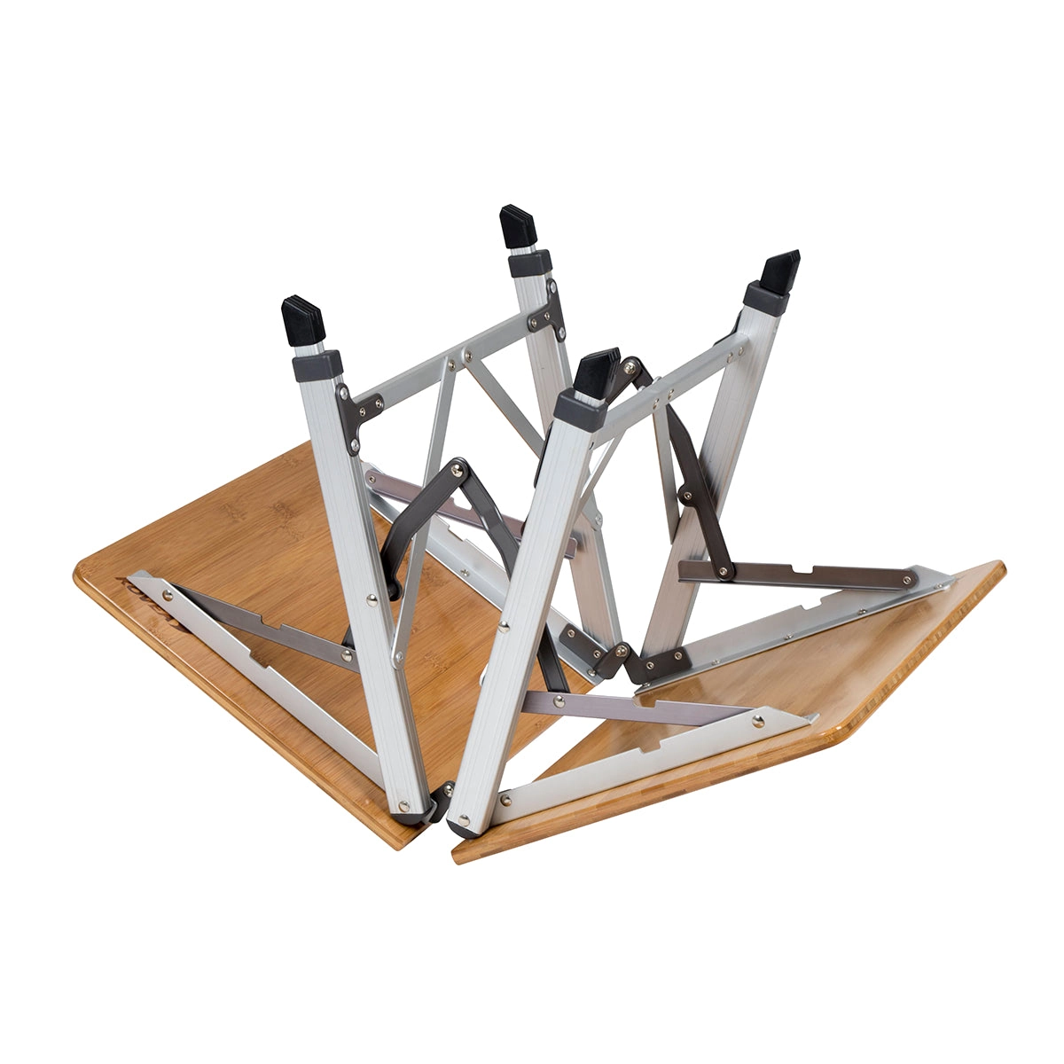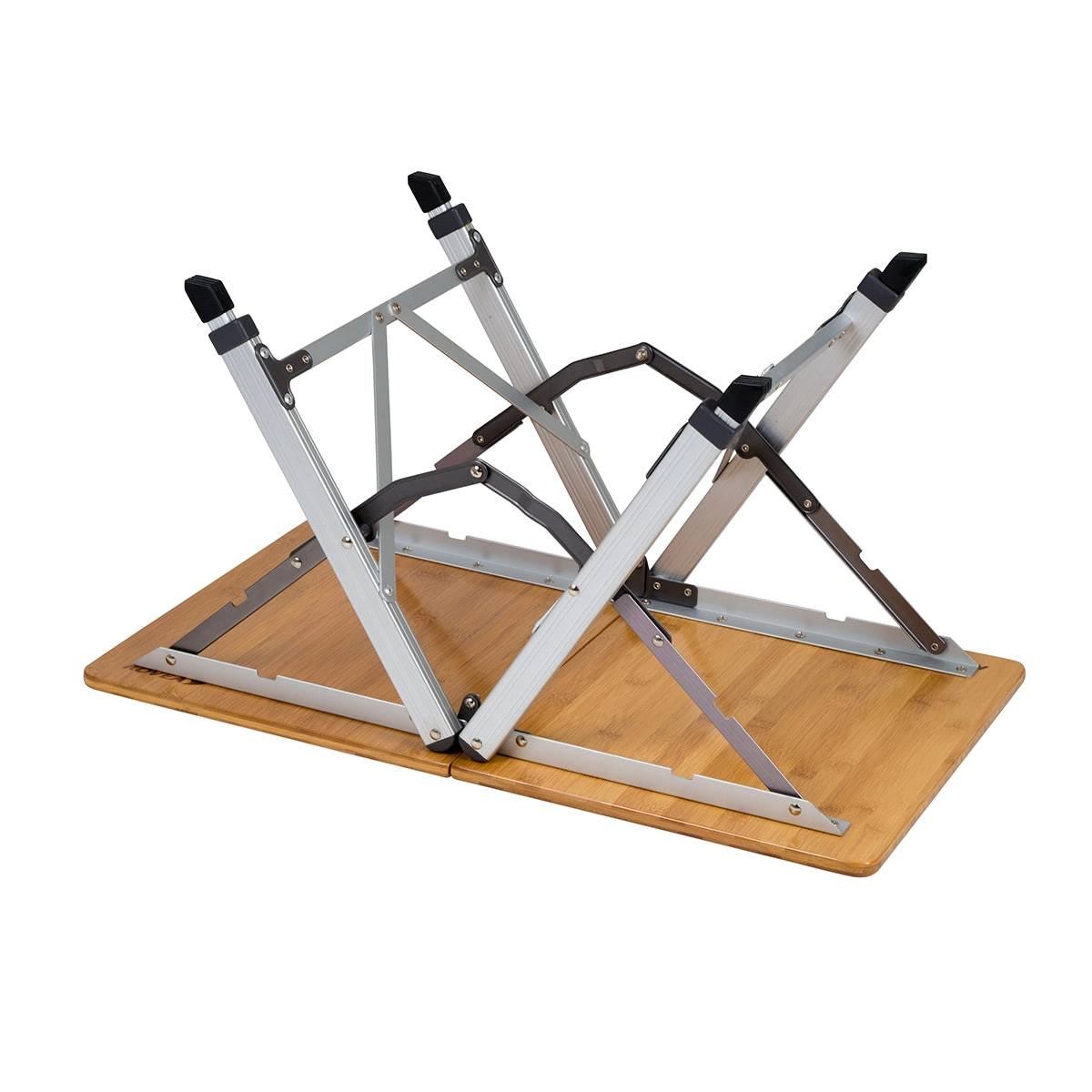 Elegante opvouwbare kampeertafel met bamboe tafelblad en lichtgewicht aluminium frame. Ideaal voor in de tuin, op de chalet of op de camping. Waterbestendige afwerking beschermt het blad tegen vocht, twee verstelbare hoogtes zorgen voor comfort bij zowel zitten als koken, en een stabiele aluminium constructie biedt zekerheid op verschillende ondergronden.