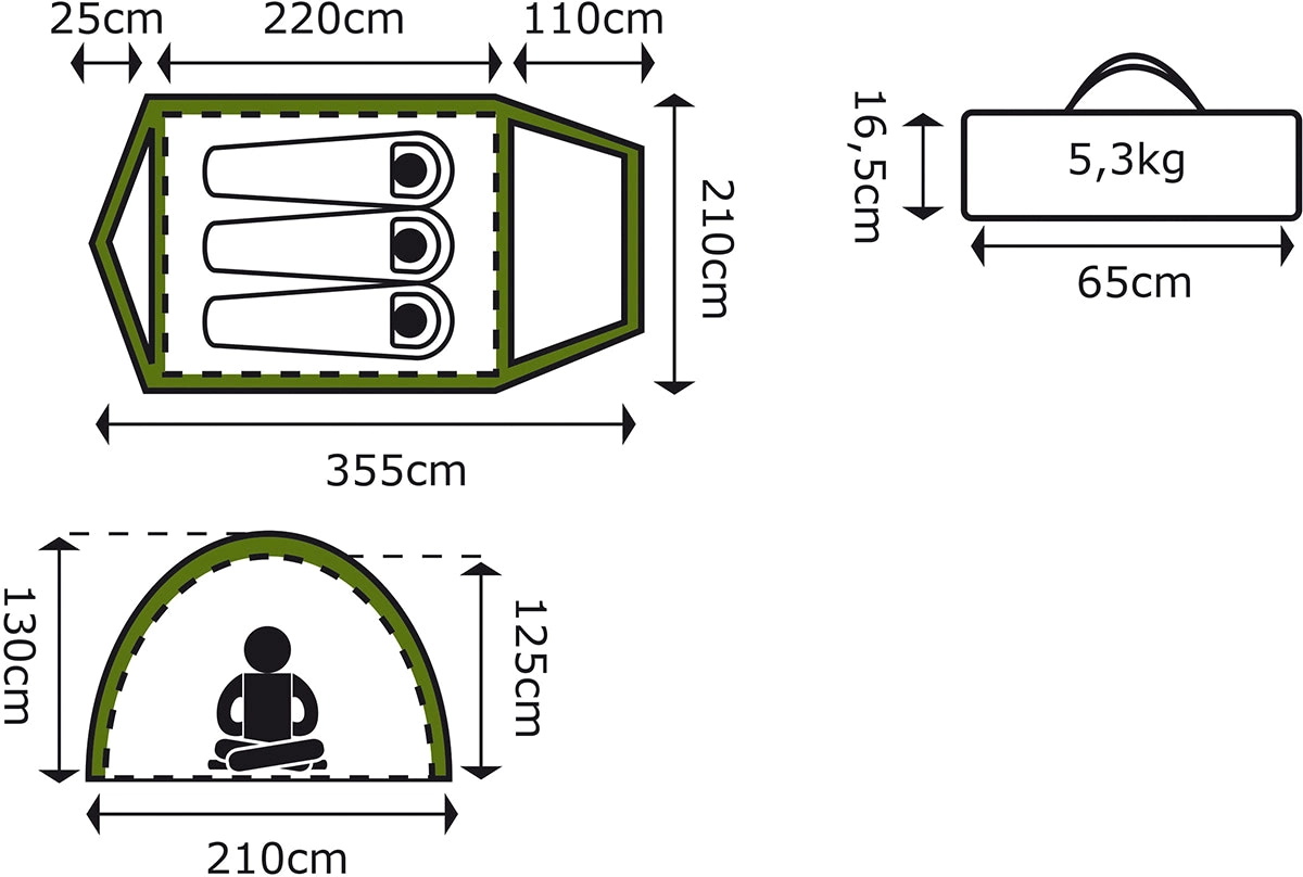 • Comfortabele binnenruimte: voor 3 personen + voorruimte 110 cm