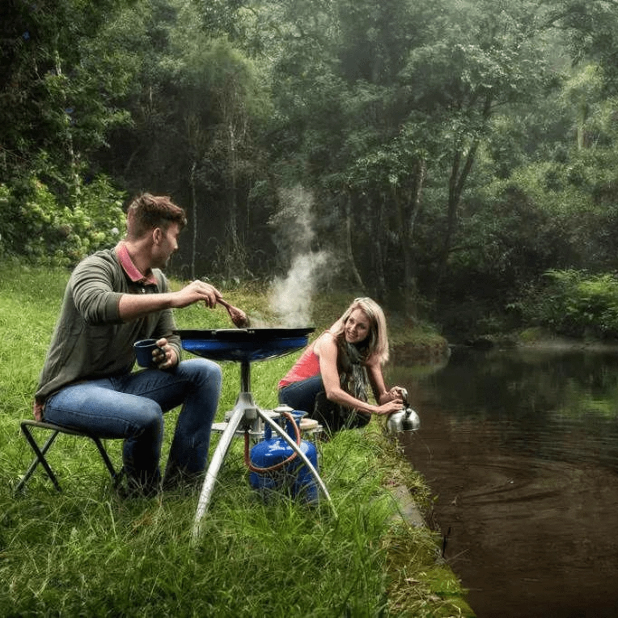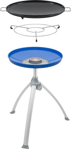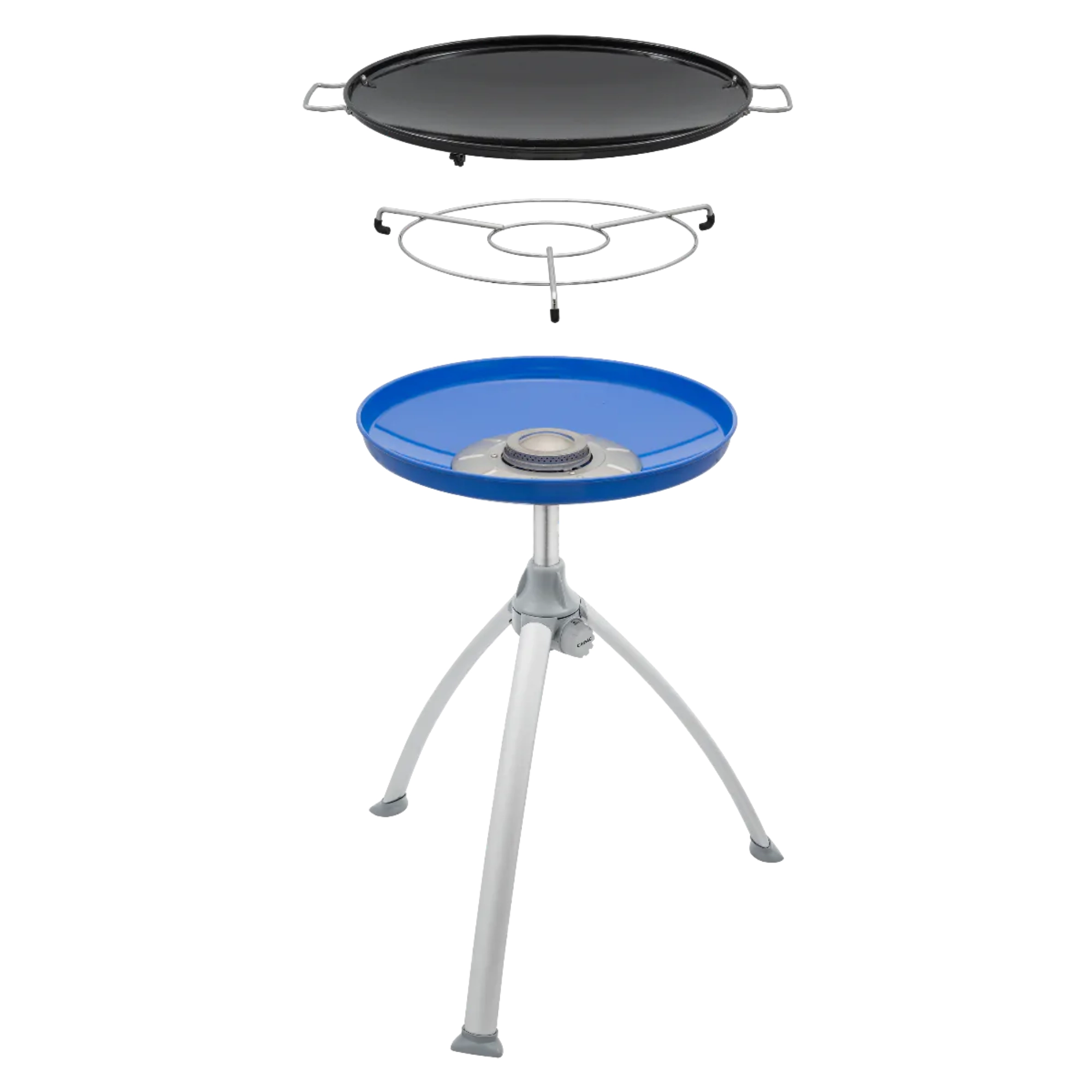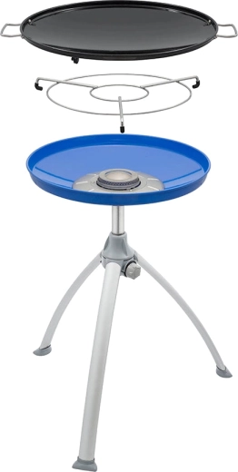 De universele en draagbare gasbarbecue CADAC Skottel Braai met een diameter van 48 cm is ideaal voor kamperen, de tuin en uitstapjes. Biedt een groot kookoppervlak, een stabiele driepoot, laag gewicht onder 6 kg en twee verwisselbare kookplaten – een gladde/geribbelde plaat en een pannenring. Dankzij het vermogen van 3 kW en de gelijkmatige warmteverdeling bereid je moeiteloos ontbijt, paella, Aziatische gerechten en sappige steaks.
