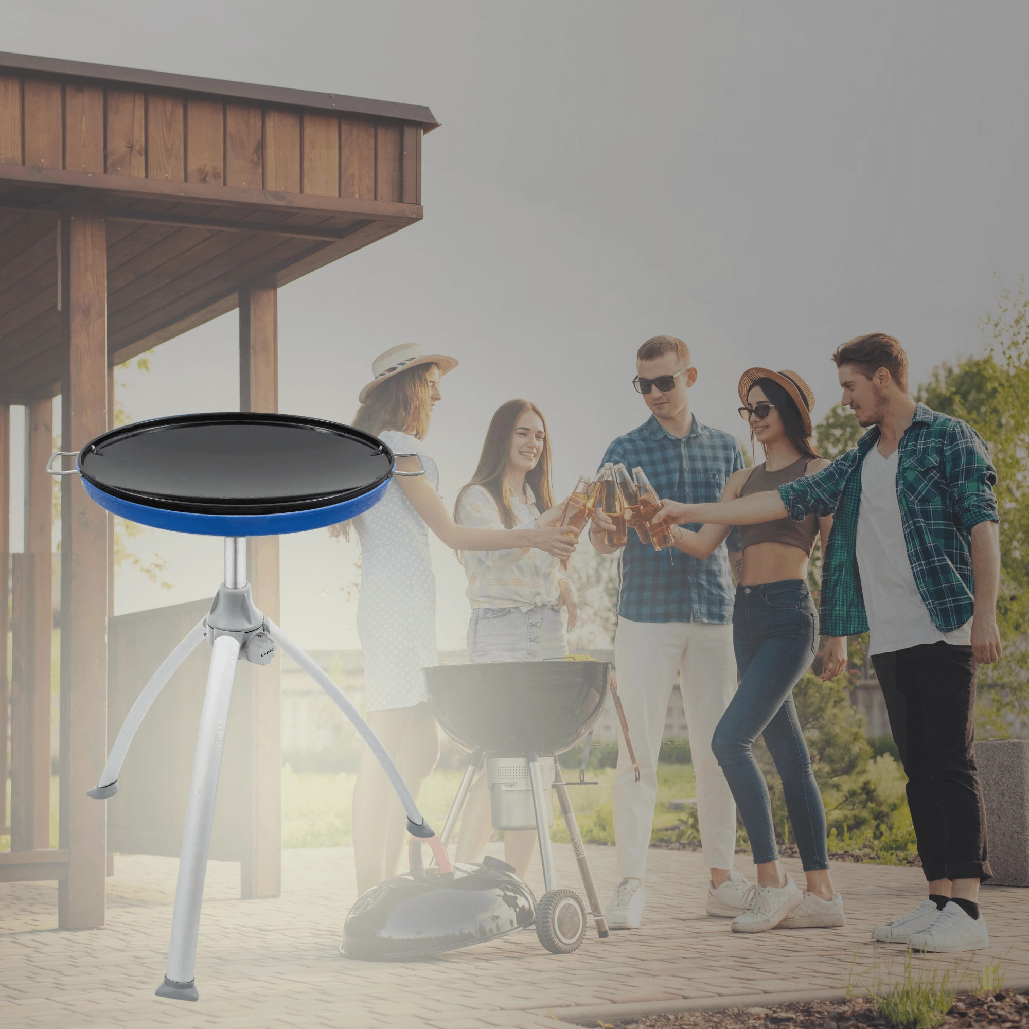 De lichte constructie met inklapbare aluminium poten en een praktische draagtas zorgt voor eenvoudig transport en opbergen. Het afneembare kruidenrek houdt alles binnen handbereik. De barbecue werkt met een navulbare propaangasfles (slang en drukregelaar niet inbegrepen).