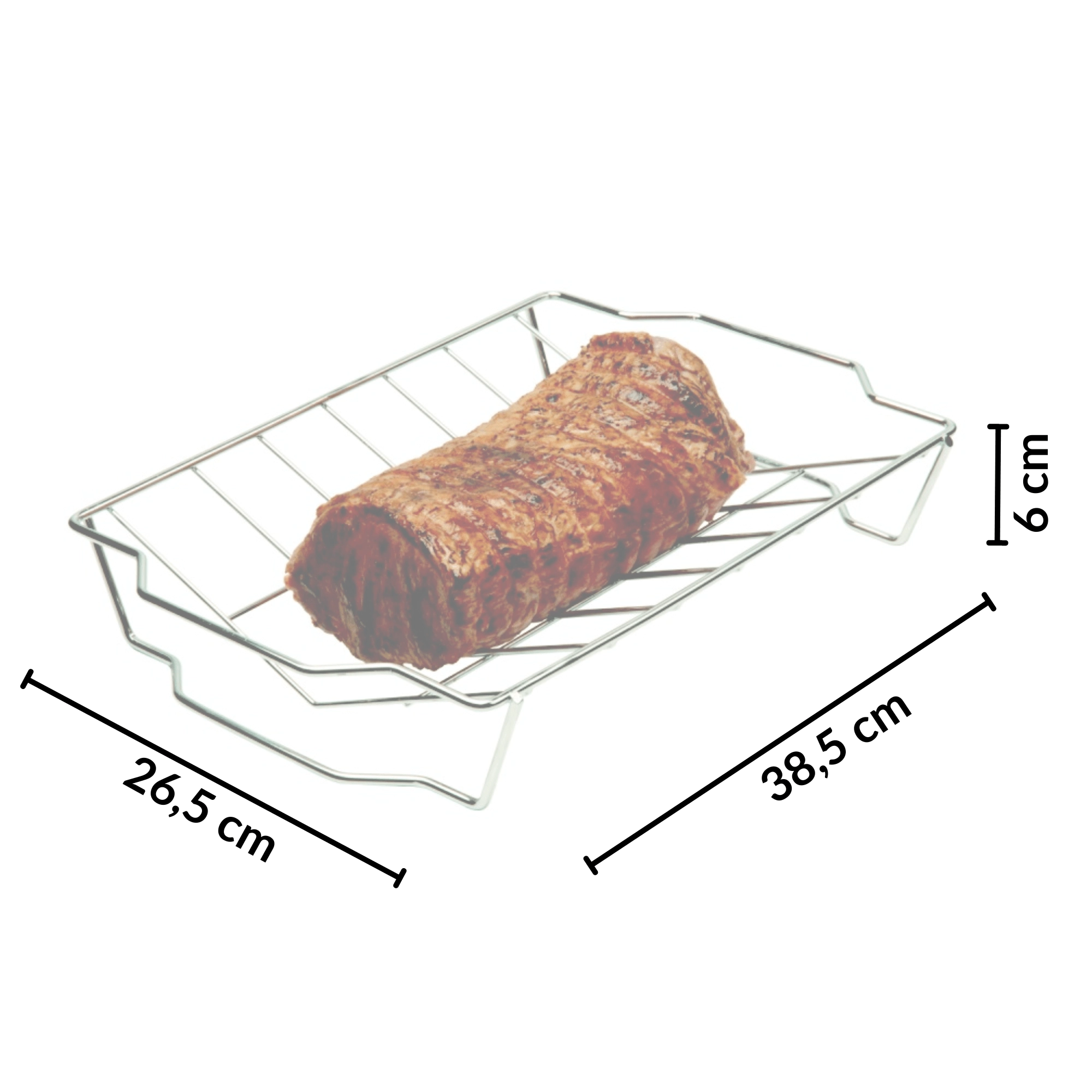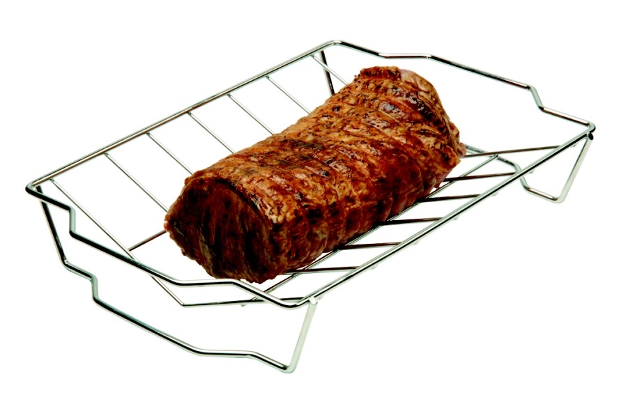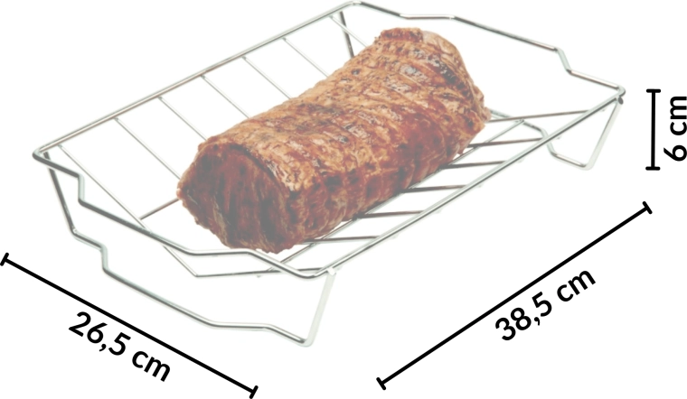 Praktische zijhandgrepen vergemakkelijken het dragen en de veilige handling op de grill en in de oven. Het rooster is multifunctioneel – ideaal voor het braden van kip, gehaktbrood, vis, spiesen en groenten en past in de meeste huishoudelijke grills en braadsledes.