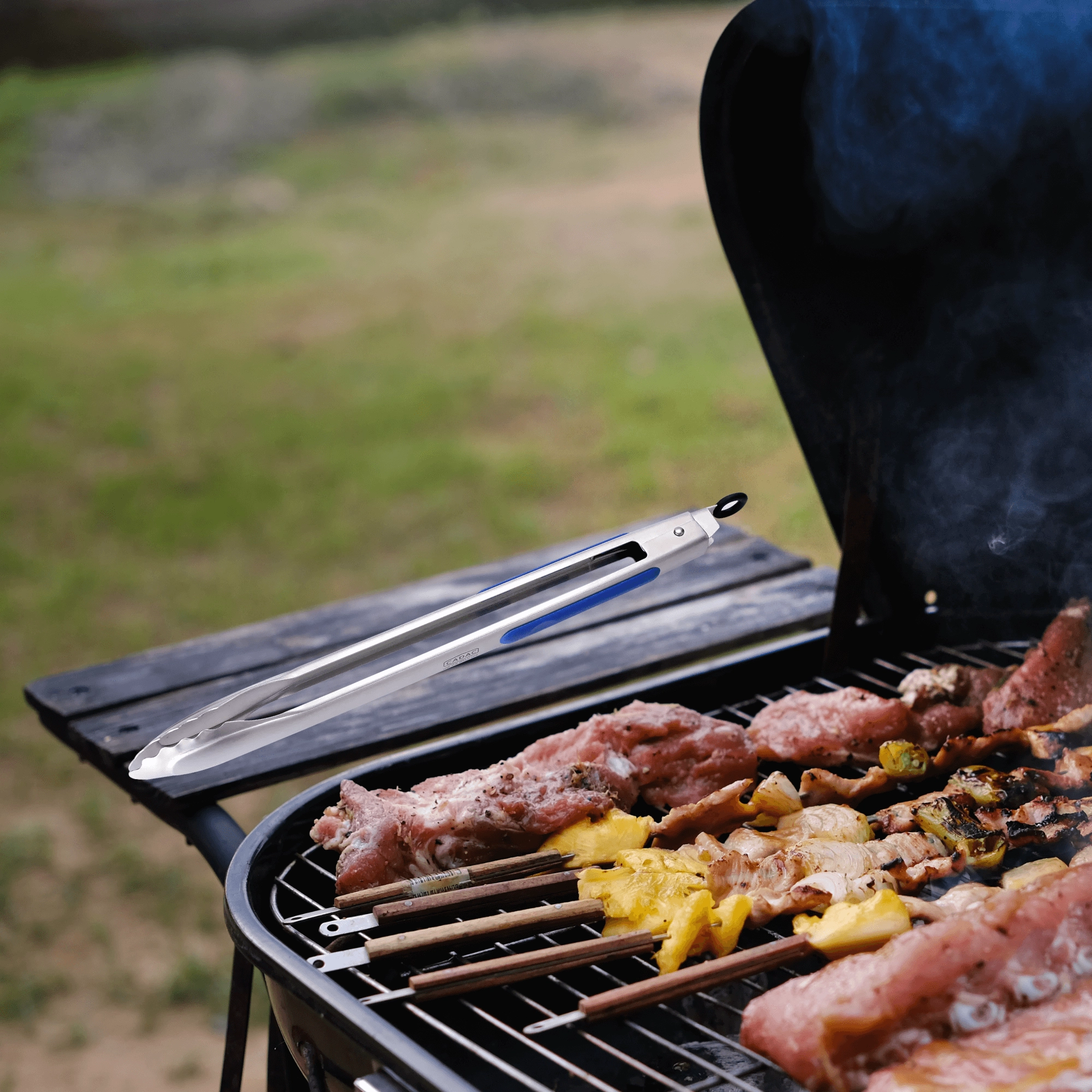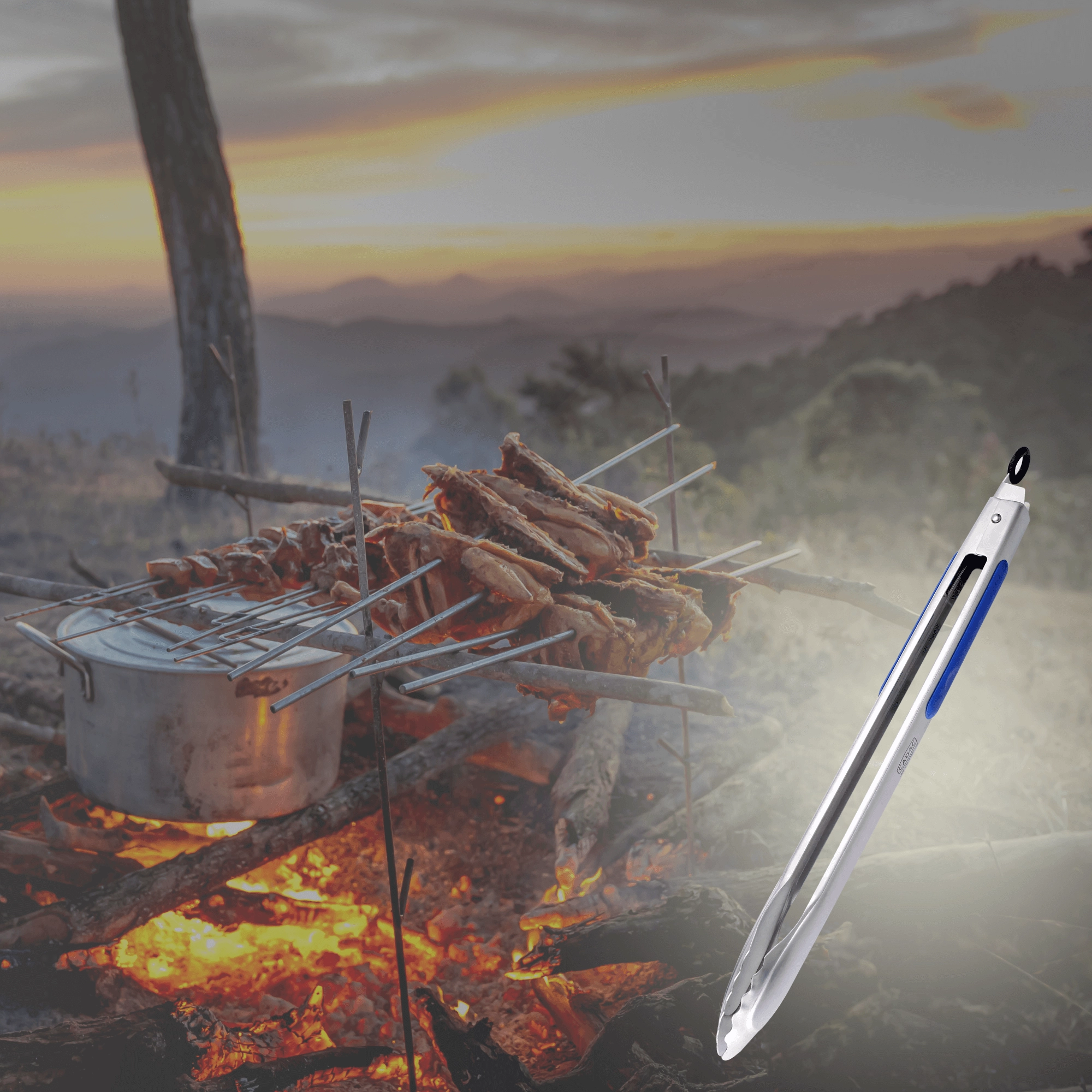 Praktische en duurzame RVS BBQ-tang met een antislip siliconen handgreep voor een zekere grip. Dankzij de lengte van 45 cm blijven je handen op afstand van de hitte, de vergrendeling voor opslag bespaart ruimte en de vaatwasserbestendigheid maakt reinigen eenvoudig – ideaal voor barbecue, pan en kamperen.