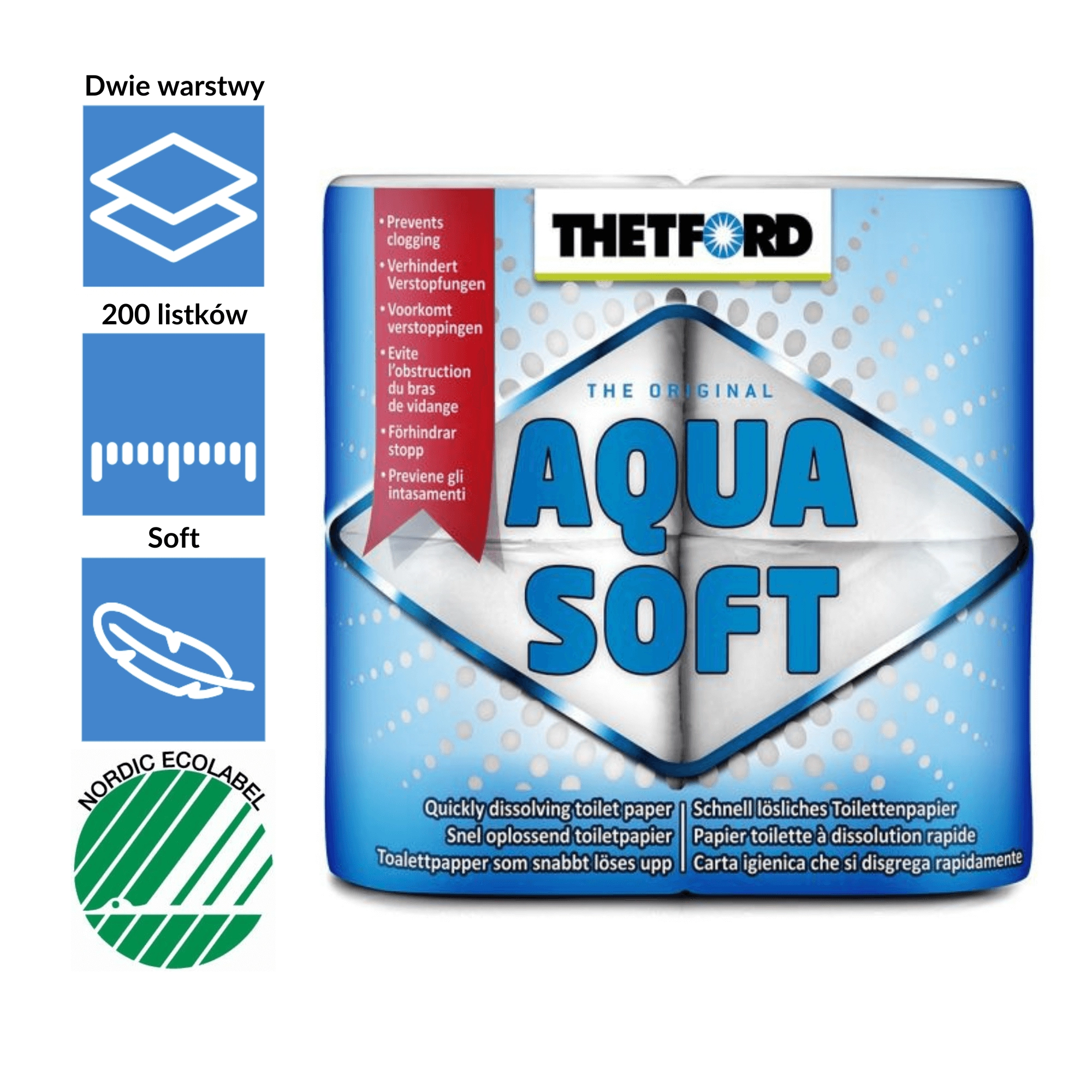 Speciaal toiletpapier THETFORD Aqua Soft is bedoeld voor chemische en reistoiletten. Het is extra zacht, lost snel op in de afvaltank, waardoor verstoppingen worden voorkomen en het legen wordt vergemakkelijkt. De milde samenstelling beschermt de bewegende onderdelen van de tank en zorgt voor een probleemloze werking.