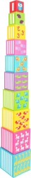 De blokken kunnen tot een hoge toren worden gestapeld of in elkaar worden geschoven. Het spel stimuleert ruimtelijk inzicht en fijne motoriek.