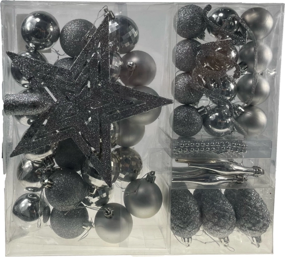 Een elegante set kerstversieringen van 48 stuks in een uniforme zilveren kleur die je boom een klassieke en feestelijke uitstraling geeft. Het lichte kunststof materiaal is breukbestendig, ideaal voor gezinnen met kinderen. De set bevat ballen in verschillende vormen en maten, een kralenguirlande en een piek in stervorm voor een complete en harmonieuze decoratie.