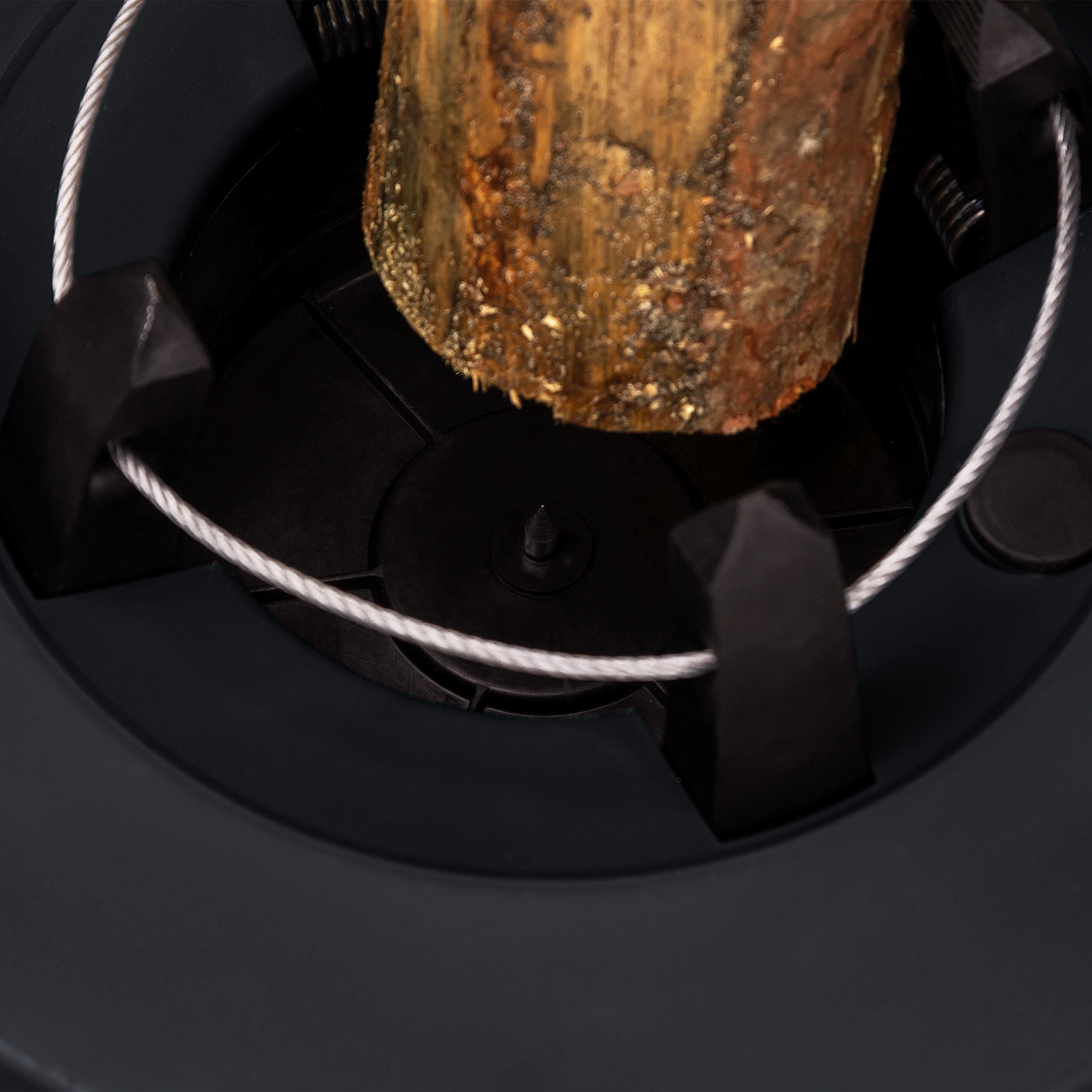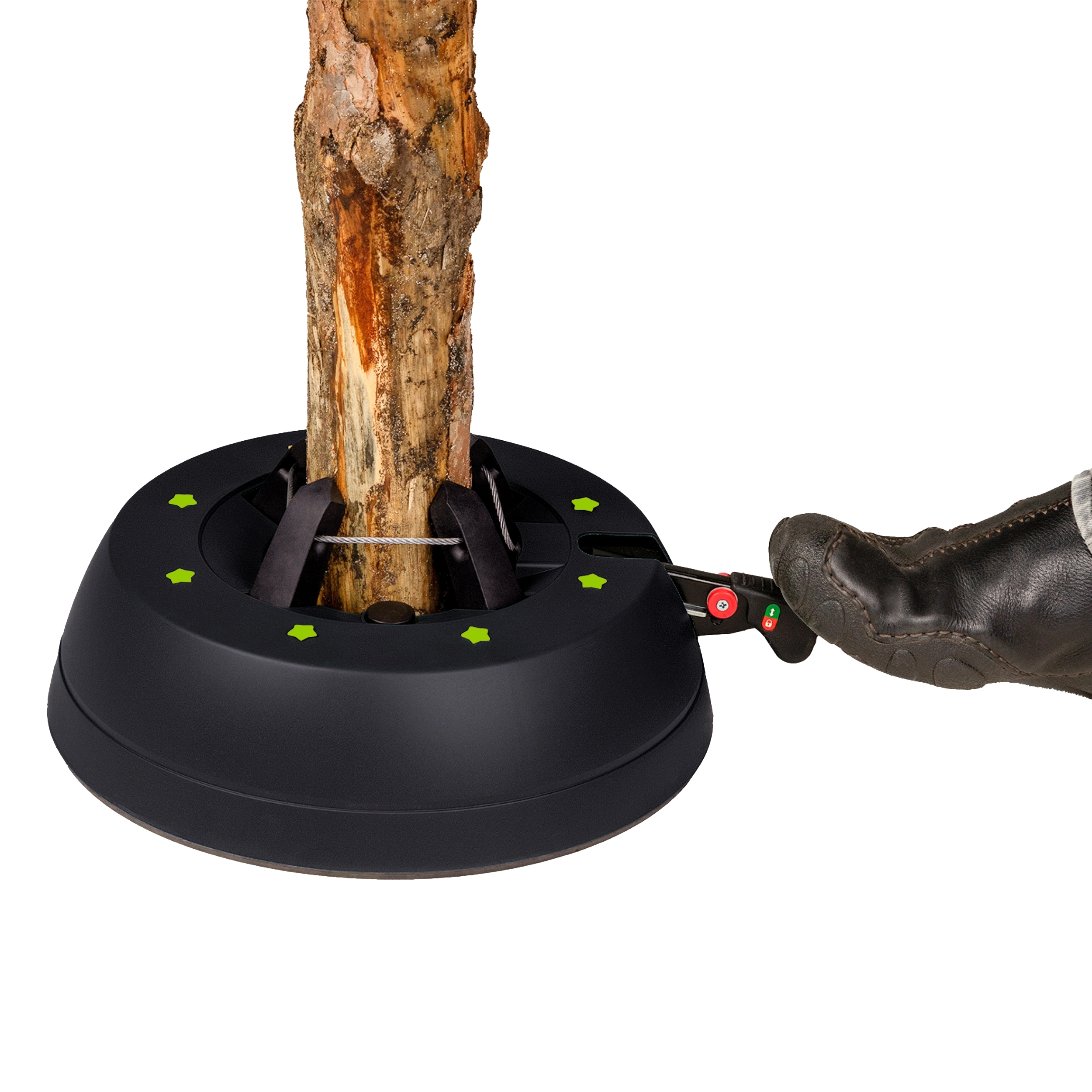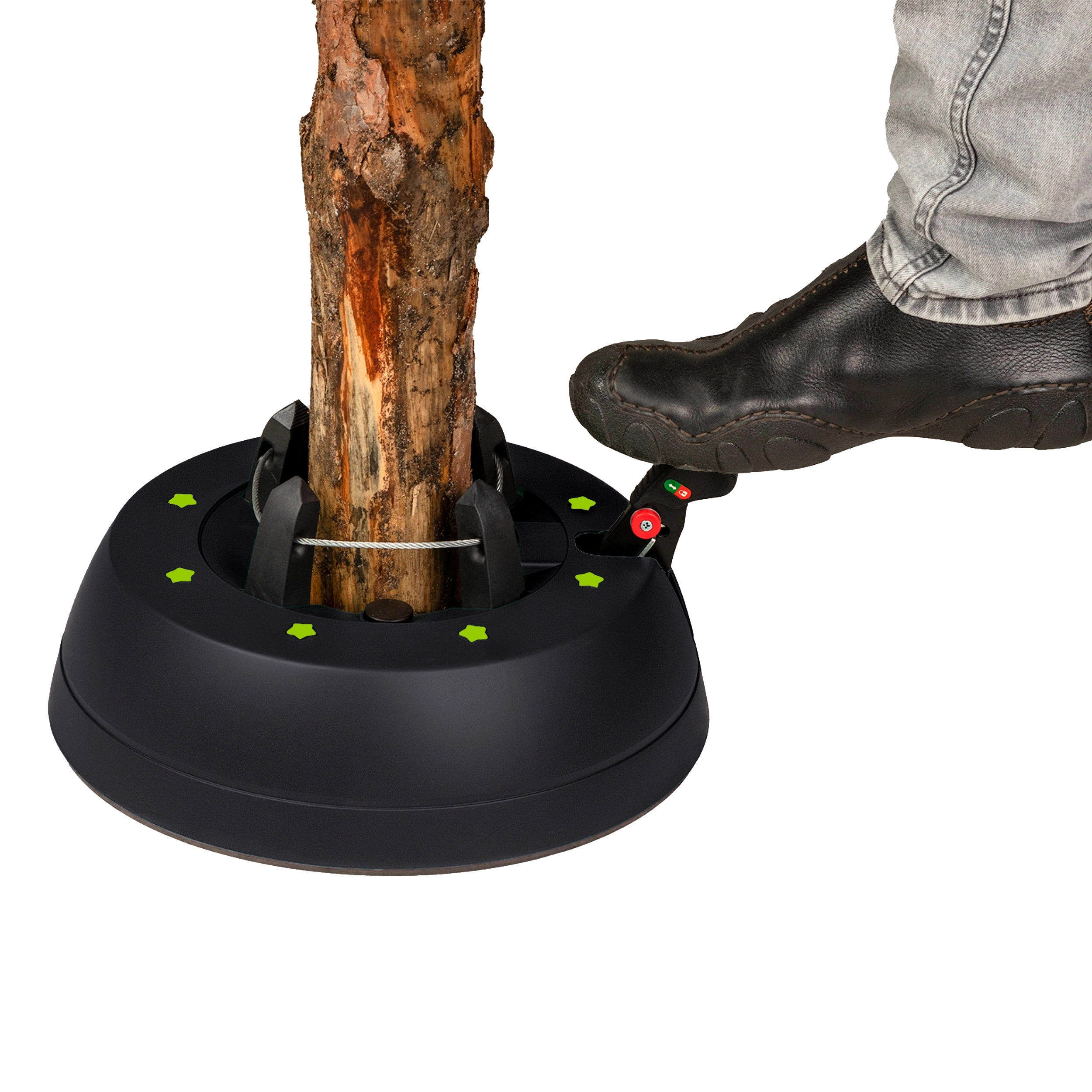 Plaats de stam op de centrale pin en bedien de hendel – de binnenklemmen trekken de boom direct aan met een stalen kabel. De hendelvergrendeling voorkomt ongewenst lossen.