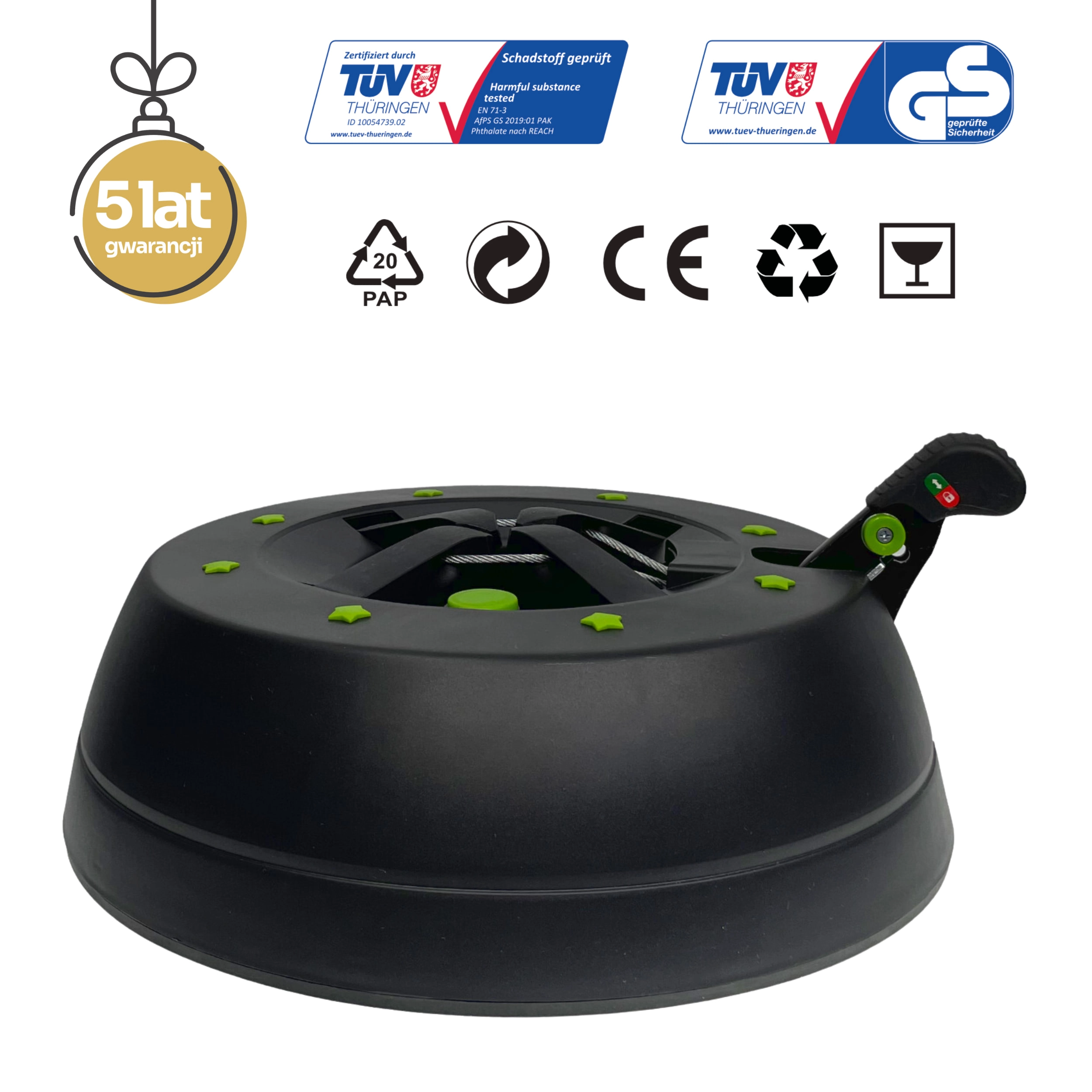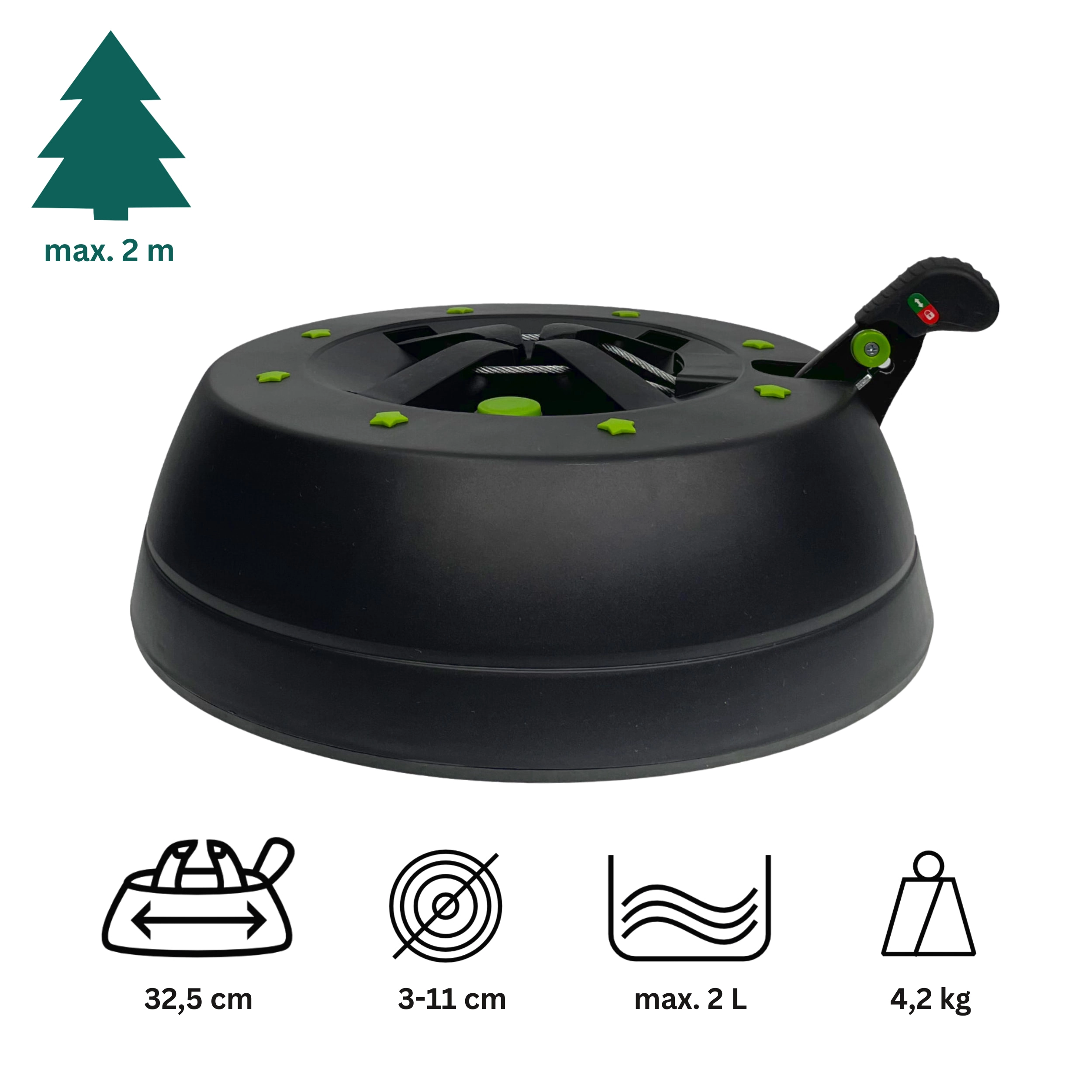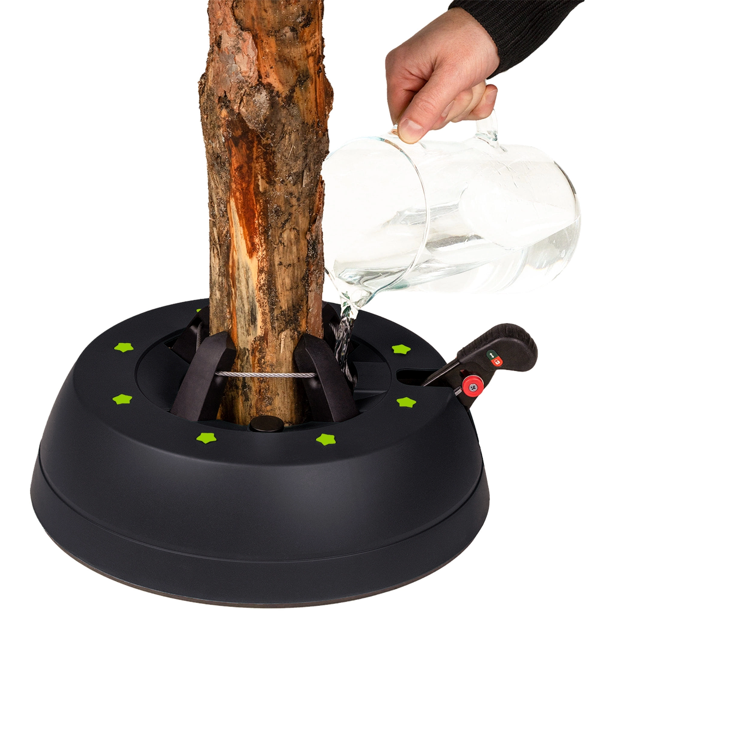 Dankzij de snelspanhendel monteert u de boom in een oogwenk: plaats de stam op de centrale pin, trap/hef de hendel enkele keren en de klemmen trekken automatisch aan. Het reservoir met een inhoud van 2 liter houdt de boom langer vers – ideaal thuis, in hotels en in commerciële ruimtes.