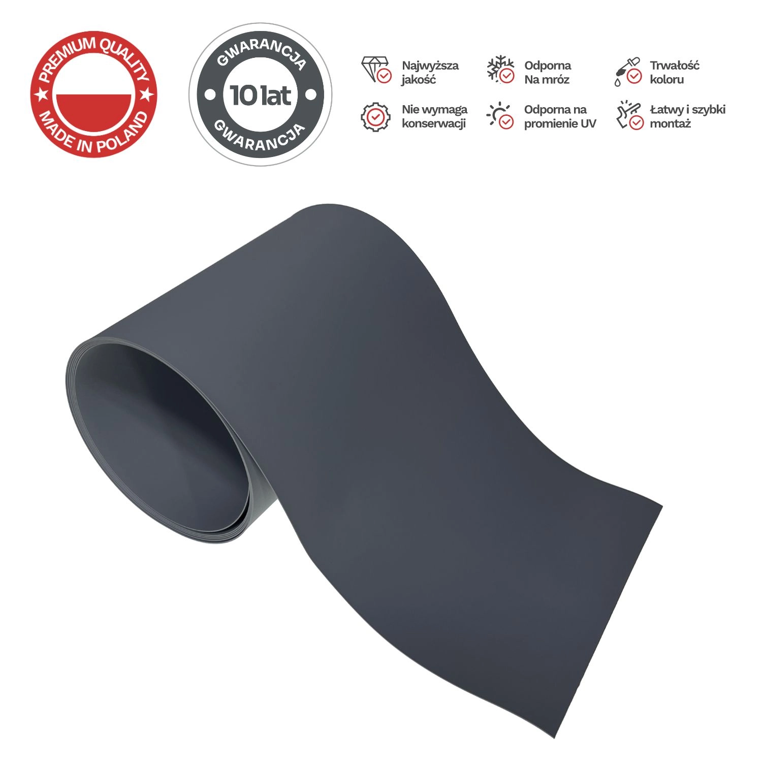 Polypropyleen (PP) is flexibel, kleurecht en bestand tegen UV-straling en vorst. De band behoudt zijn vorm en de RAL 7016-kleur vele jaren.