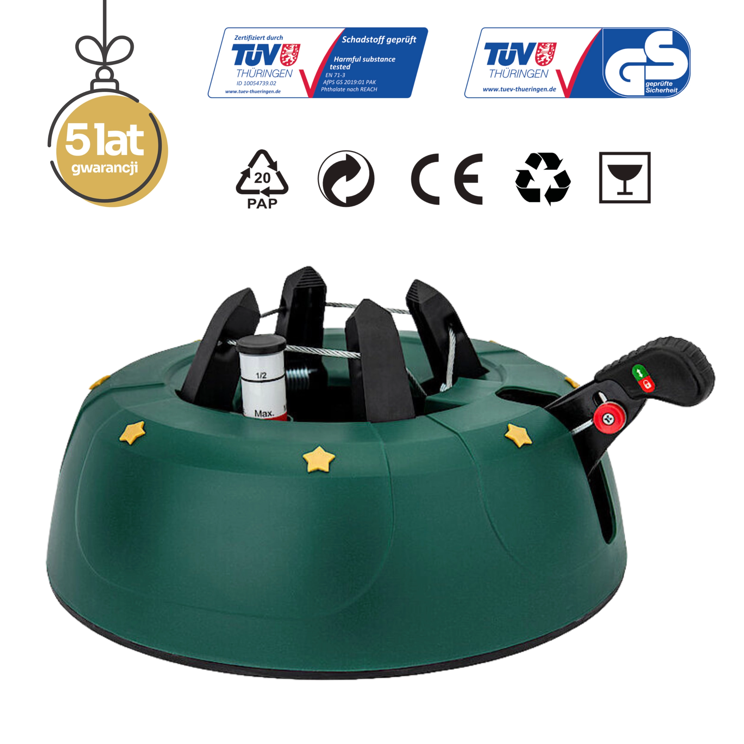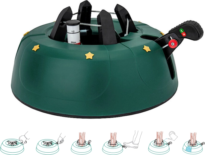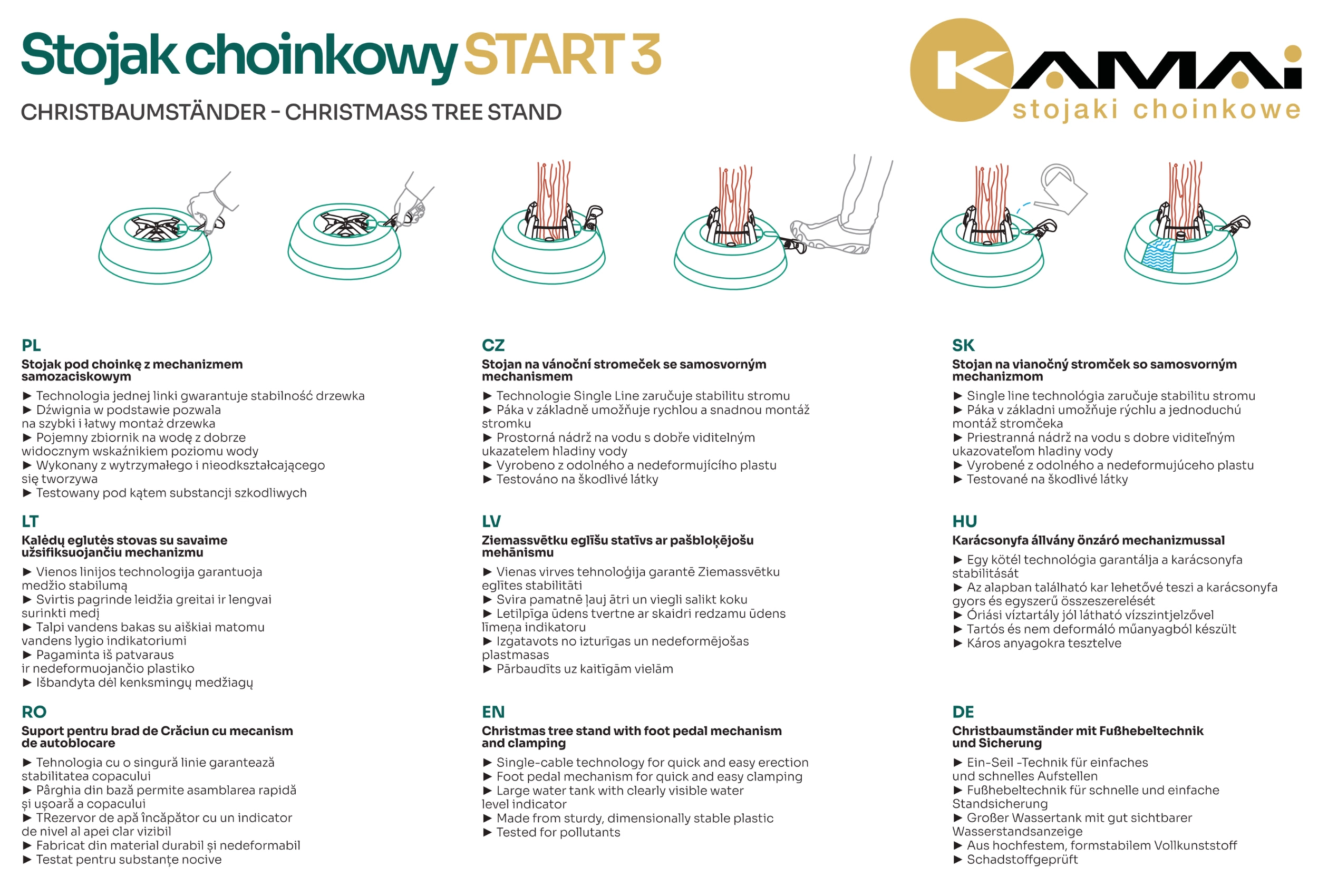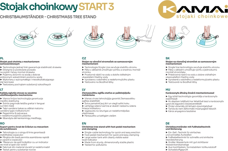 De robuuste standaard voor echte kerstbomen Kamai Start 3 zorgt voor maximale stabiliteit en moeiteloze, snelle montage. Dankzij de automatische klemmen met staalkabel, het waterreservoir van 3 l met peilindicator en de veiligheidsvergrendeling van de hendel blijft de boom tijdens de hele feestperiode recht en vers.
