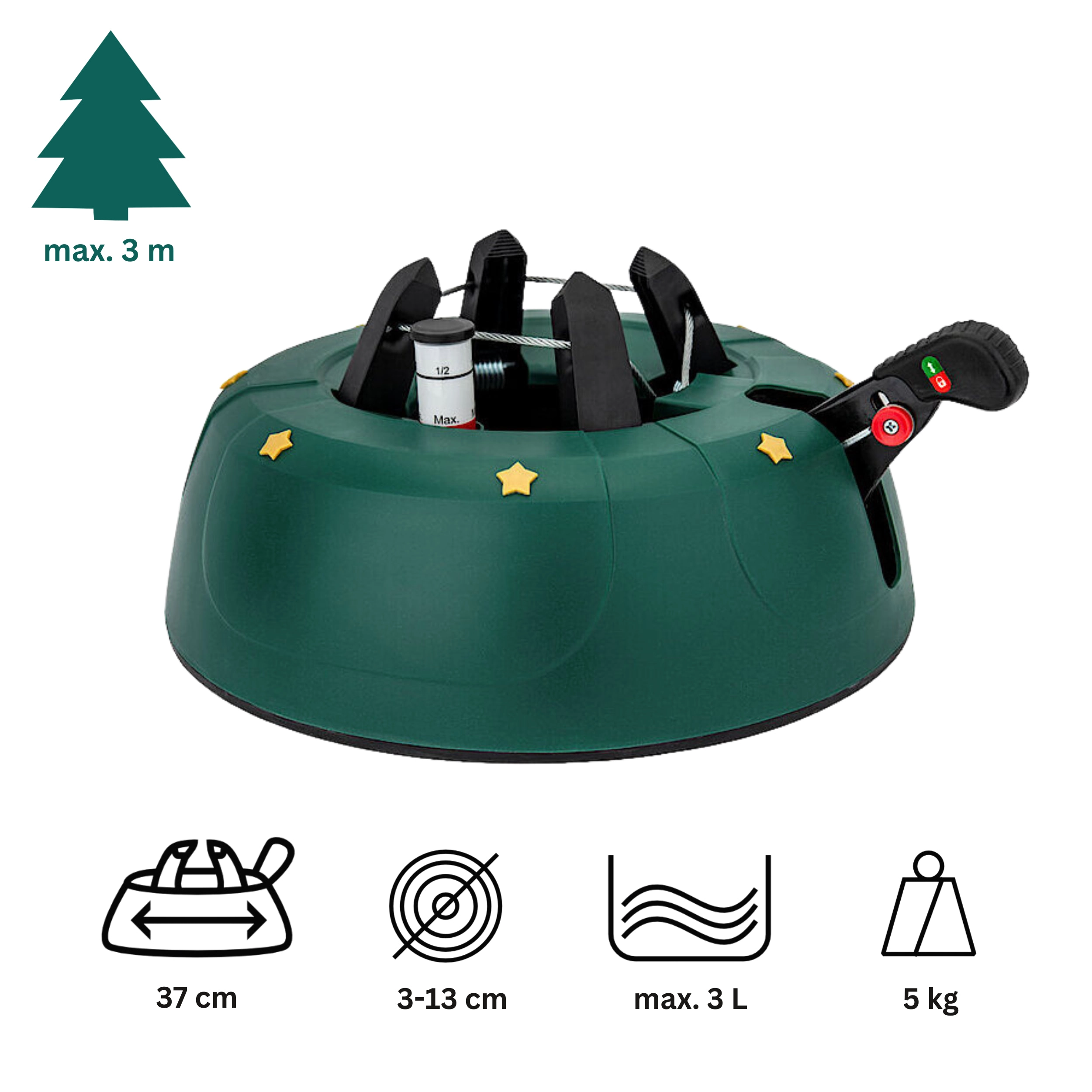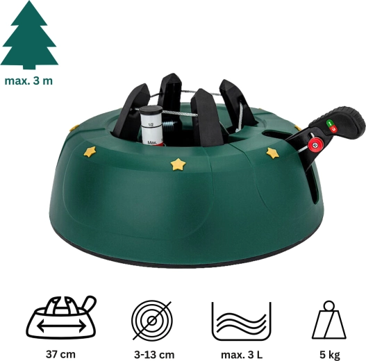 De Kamai Start 3 is een betrouwbare standaard voor echte kerstbomen tot een hoogte van 3 meter. De brede basis, het gewicht van 5 kg en vier zelfklemmende haken met een sterke staalkabel omsluiten de stam (3–13 cm) stevig en houden deze perfect verticaal. Het geïntegreerde waterreservoir van 3 liter met een vlotter-peilindicator helpt de naalden langer fris te houden.