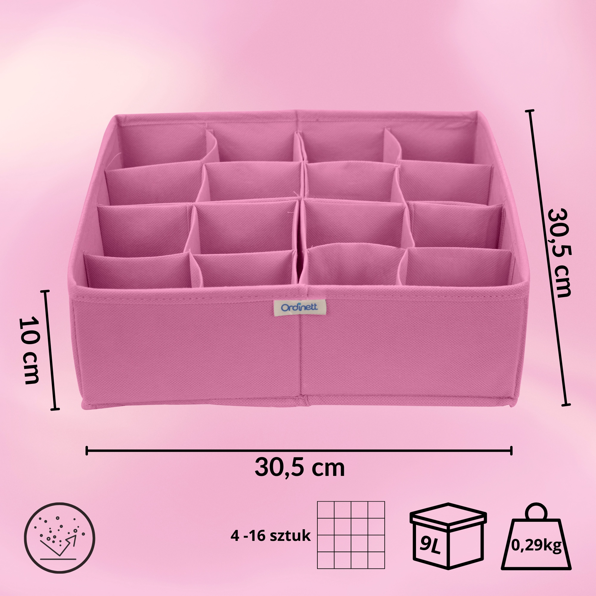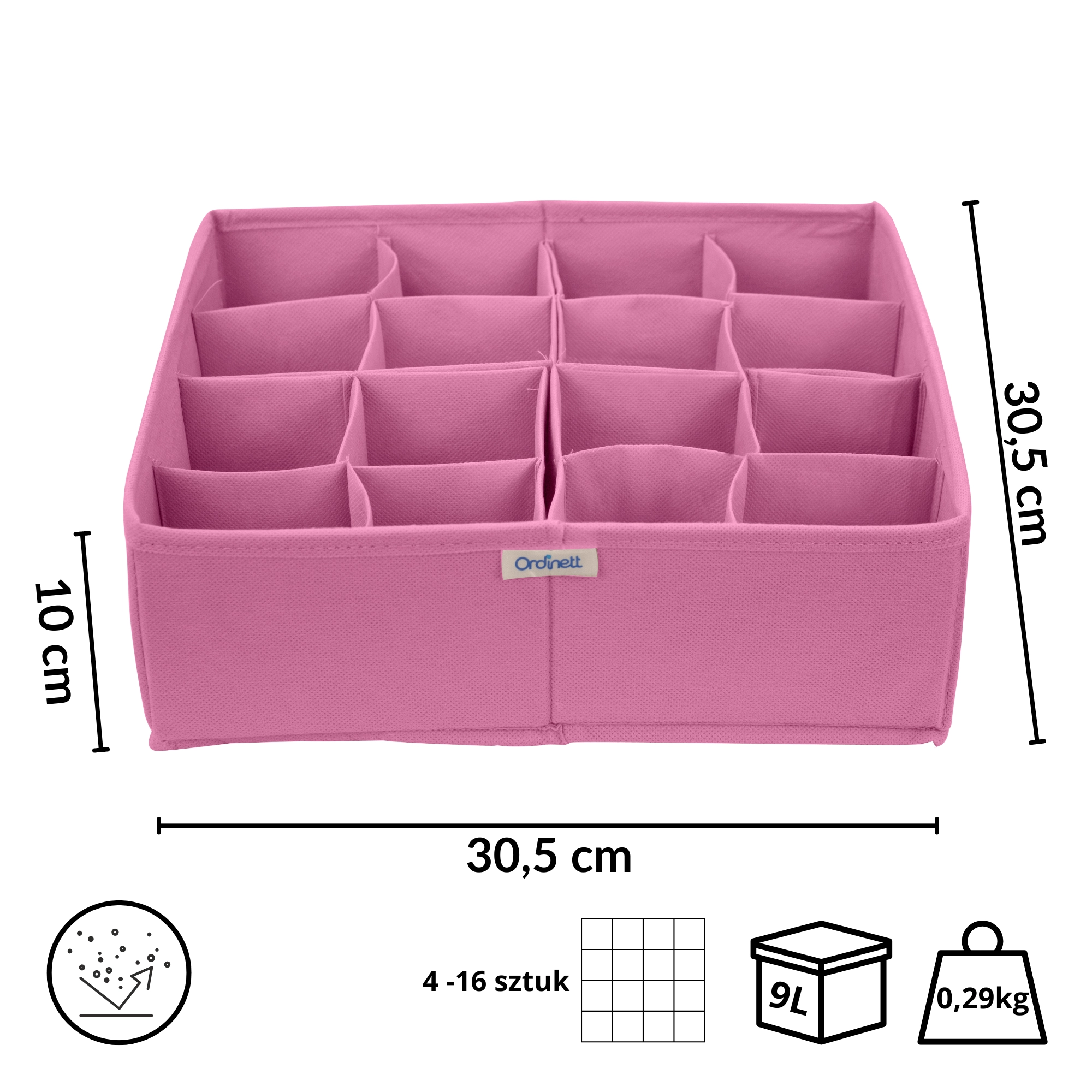 Breng voorgoed orde in je laden. De textiele organizer BLOSSOM biedt 16 vakken voor het overzichtelijk opbergen van sokken, ondergoed, accessoires en cosmetica. Hij heeft een compact, vierkant formaat van 30,5 × 30,5 × 10 cm, is opvouwbaar, licht en gemaakt van duurzame non-woven textiel in elegant roze.
