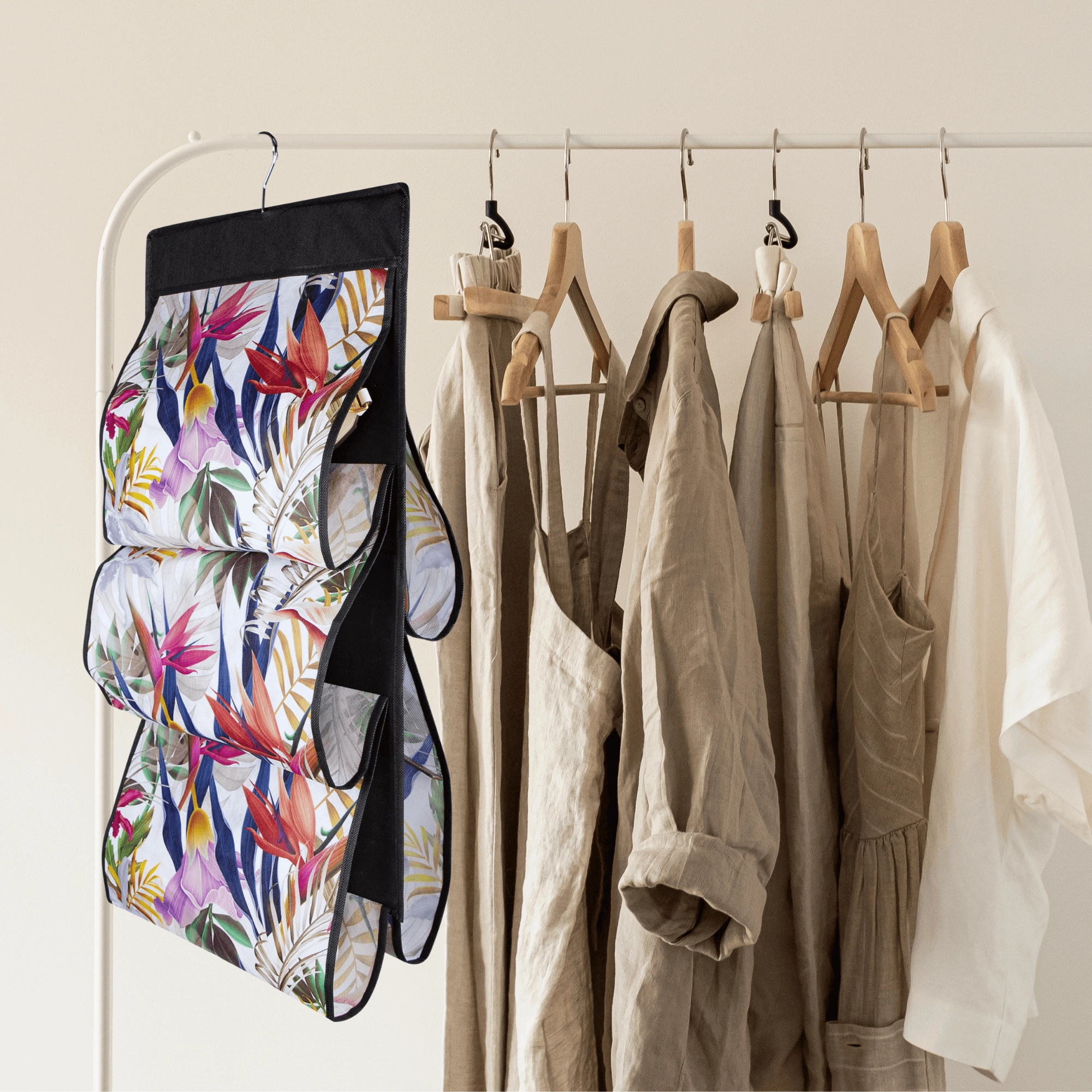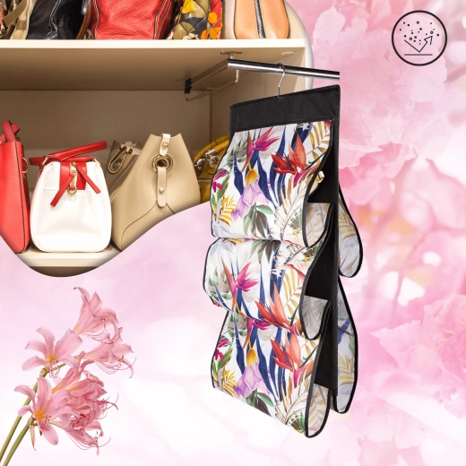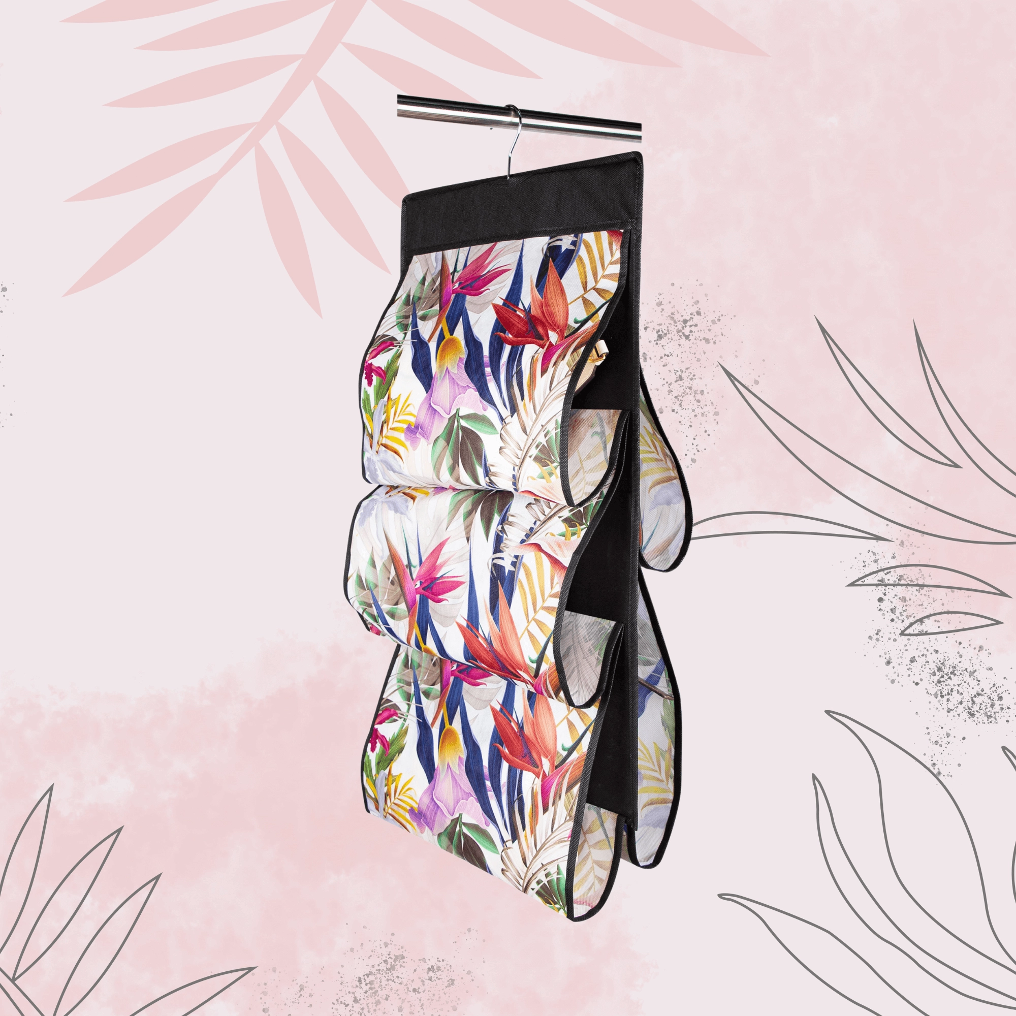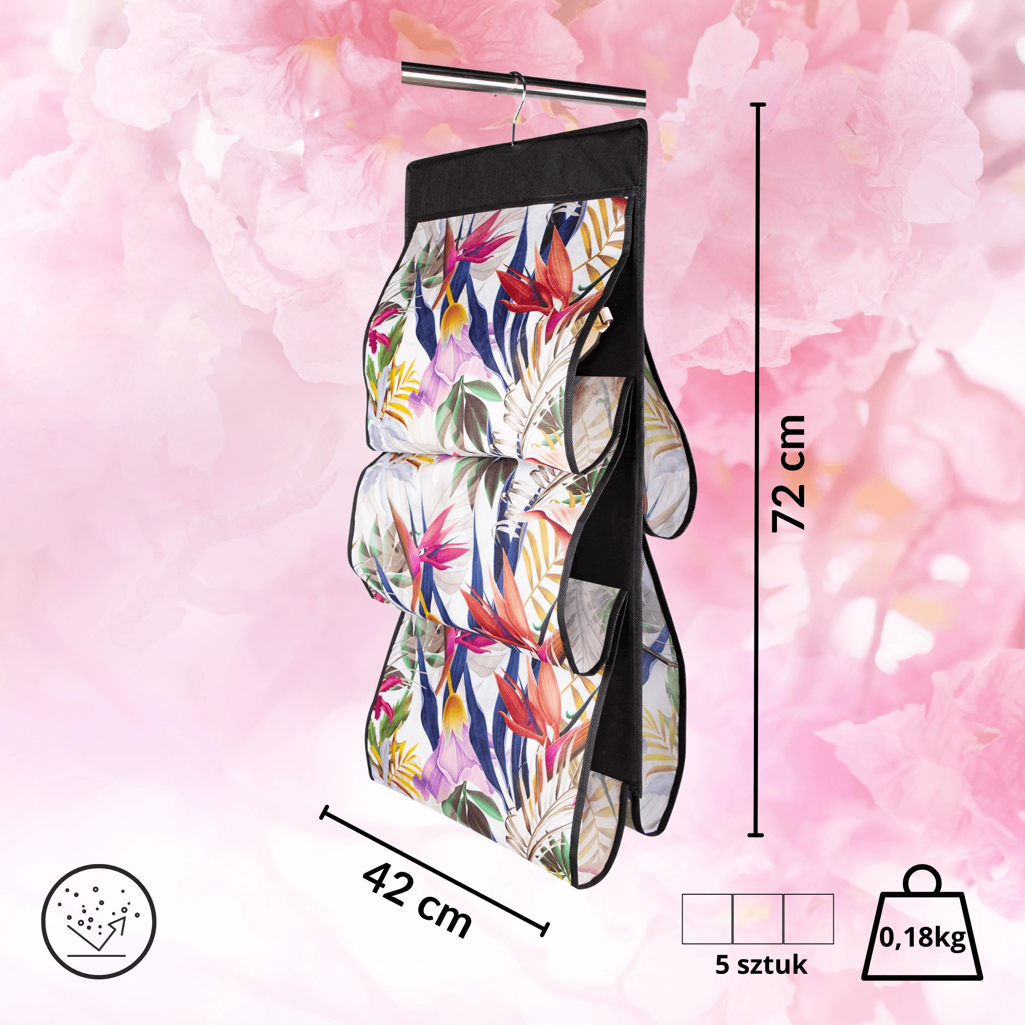 De hangende organizer FLORAL is een slimme oplossing voor verticale opslag van handtassen en accessoires. Dankzij de vijf overzichtelijke vakken heb je alles binnen handbereik en blijft je kast georganiseerd. De luchtige en duurzame non-woven PET-stof beschermt tegen stof en slijtage, is licht van gewicht en gemakkelijk te onderhouden.