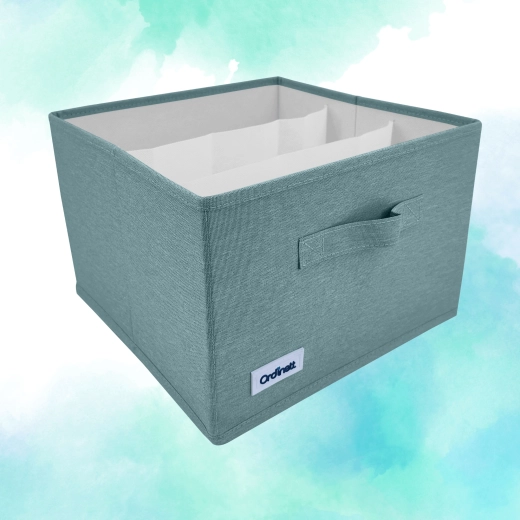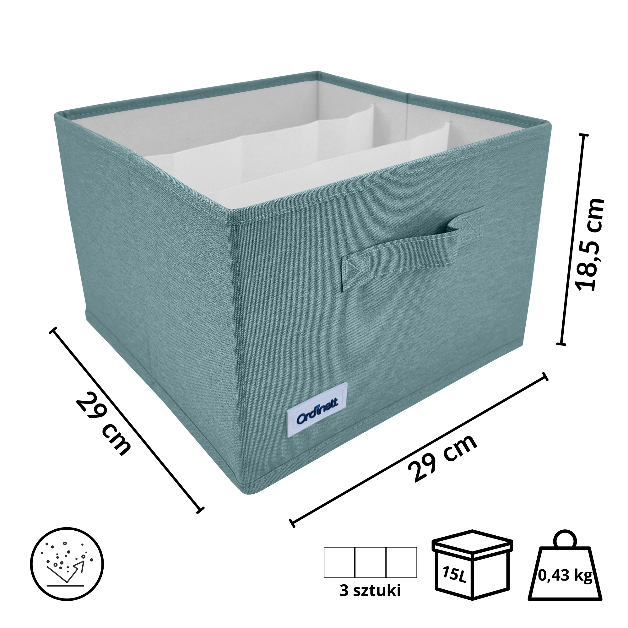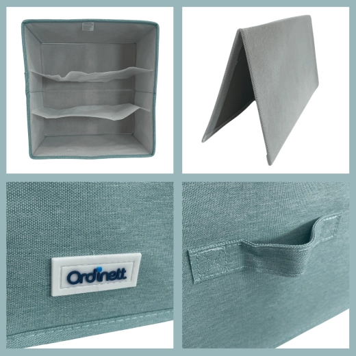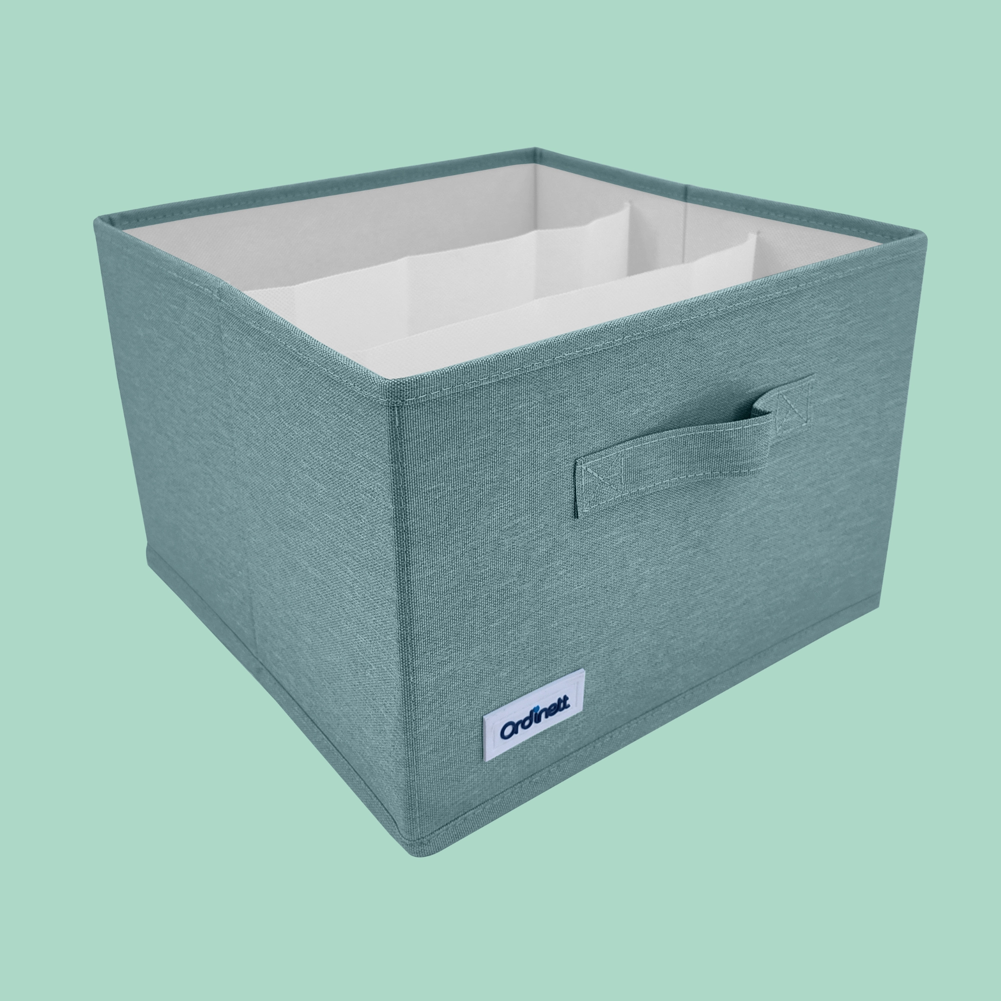 Houd je kast perfect opgeruimd met deze mintkleurige textiele organizer. Dankzij de overzichtelijke vakken, de voorste greep en de opvouwbare constructie sorteer je gemakkelijk wasgoed, accessoires of kinderspeelgoed. De stevige uitvoering van duurzame polyester en het universele formaat 29 × 29 × 18,5 cm passen in planken, rekken en garderobesystemen.