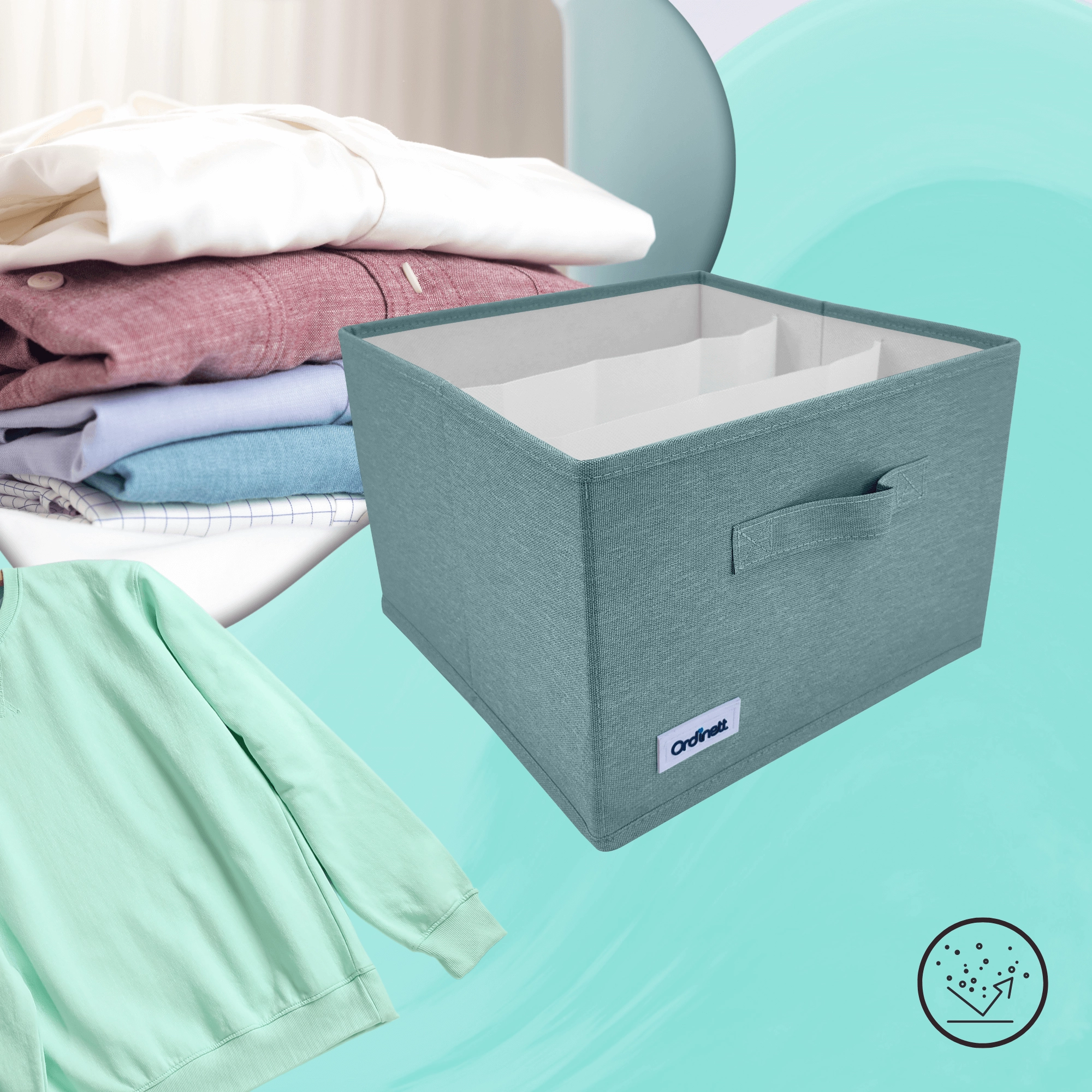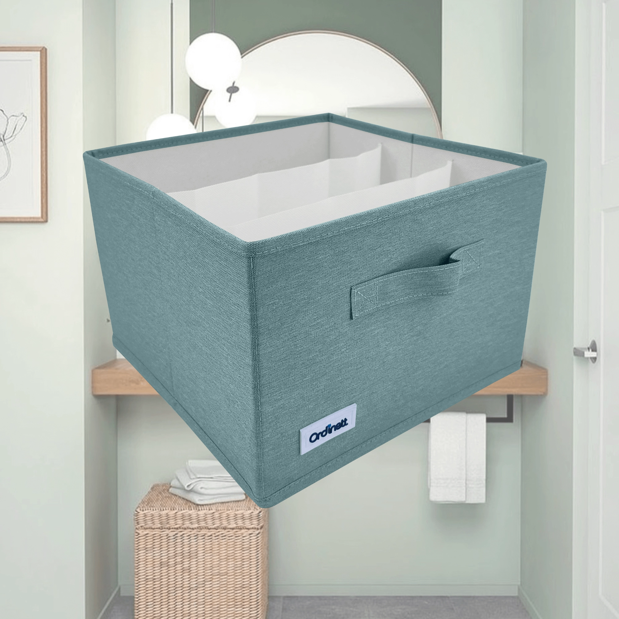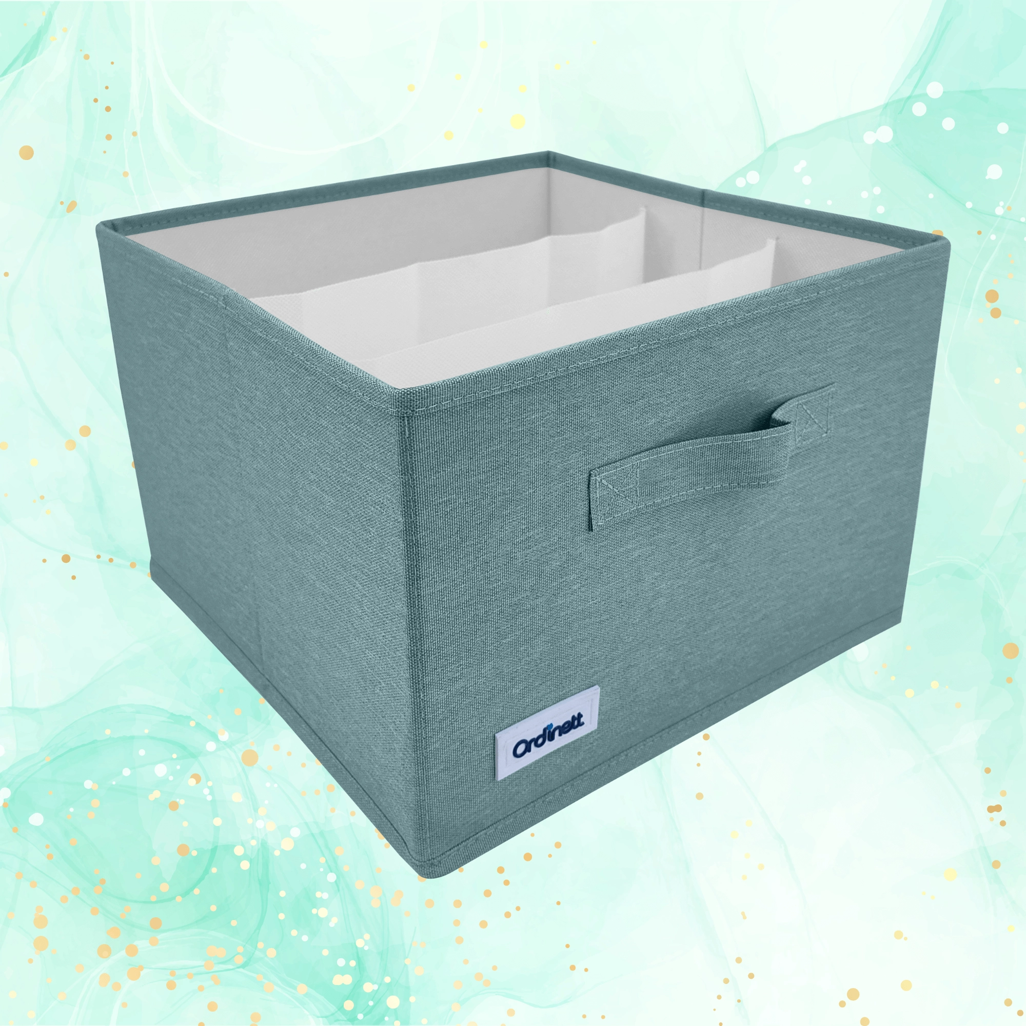 Houd je kast perfect opgeruimd met deze mintkleurige textiele organizer. Dankzij de overzichtelijke vakken, de voorste greep en de opvouwbare constructie sorteer je gemakkelijk wasgoed, accessoires of kinderspeelgoed. De stevige uitvoering van duurzame polyester en het universele formaat 29 × 29 × 18,5 cm passen in planken, rekken en garderobesystemen.
