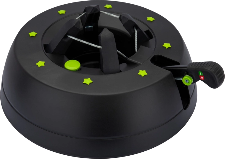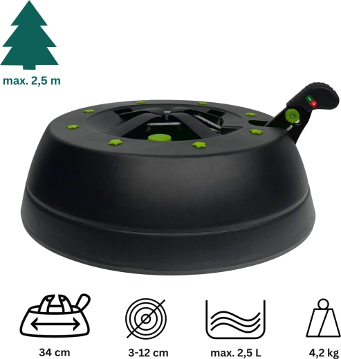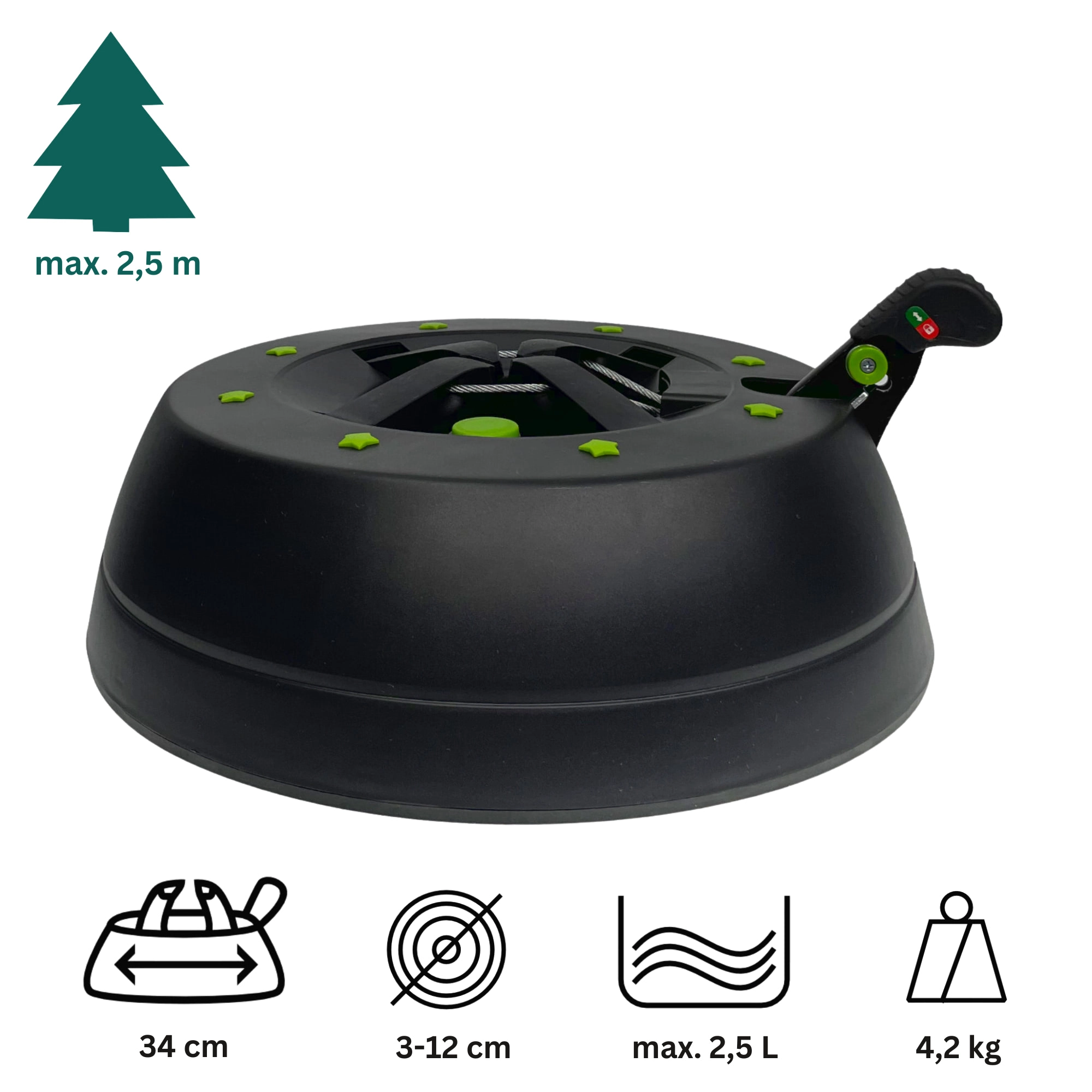 Het geïntegreerde waterreservoir van 2,5 l met vlotterindicator bewaakt de juiste hydratatie – ideaal voor echte bomen van populaire soorten zoals spar, zilverspar of den. Het design in diep antraciet met groene sterren past elegant in elk interieur.