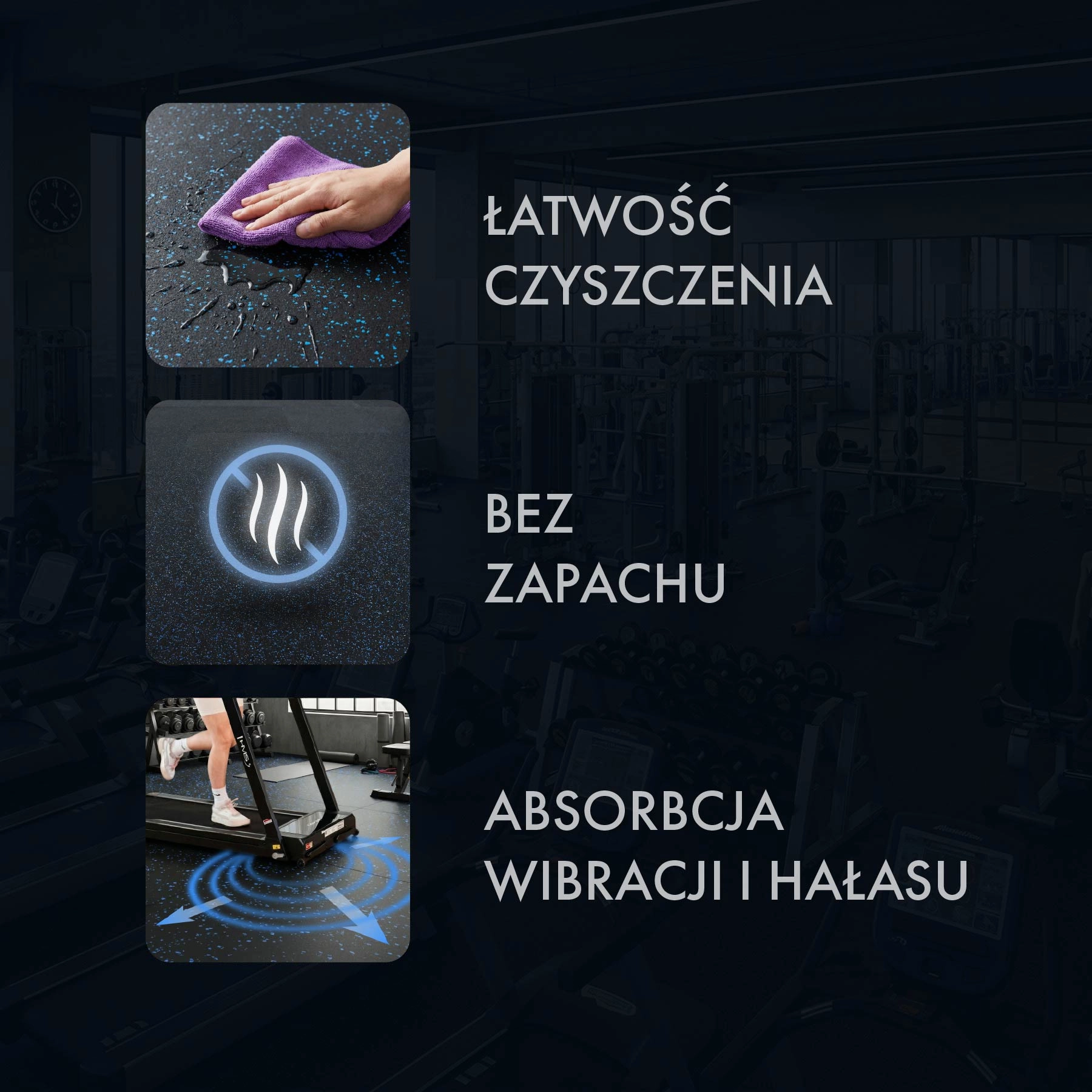 Elke plaat van 1 × 1 m wordt verbonden met montagekoppelstukken die verschuiven voorkomen, het oppervlak vlak houden en snelle montage en demontage mogelijk maken. Deze variant is een uitstekende keuze onder cardio‑ en krachtapparatuur, in zones met vrije gewichten en voor thuisgyms.