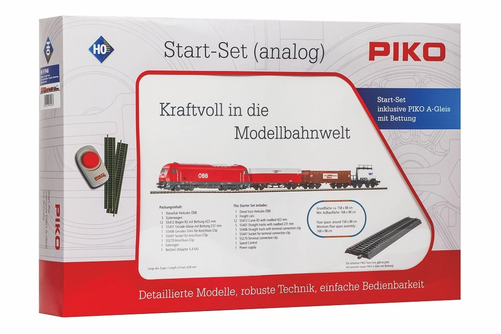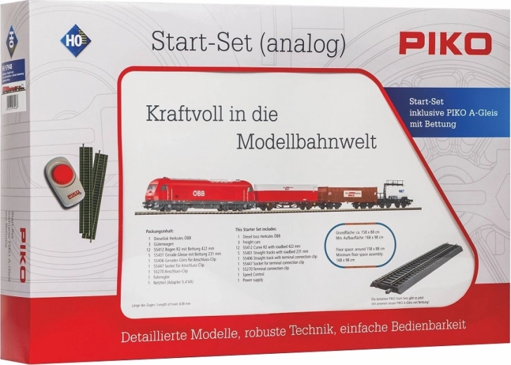 Complete modelbouwset van PIKO voor schaal H0, met alles voor direct rijden: ÖBB Hercules diesellocomotief, 3 goederenwagens, ovaal PIKO A-Gleis met bedding, voeding en analoge regelaar. Dankzij de eenvoudige montage, betrouwbare loop en mogelijkheid tot uitbreiding en digitalisering (NEM 652) ideaal voor zowel beginners als gevorderden.