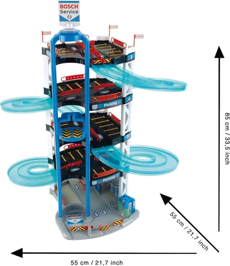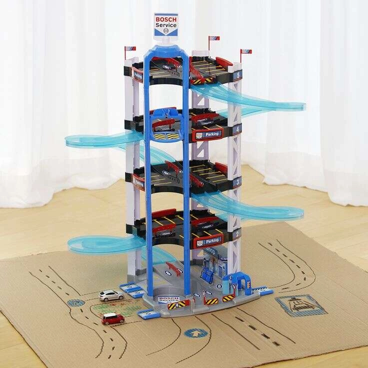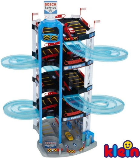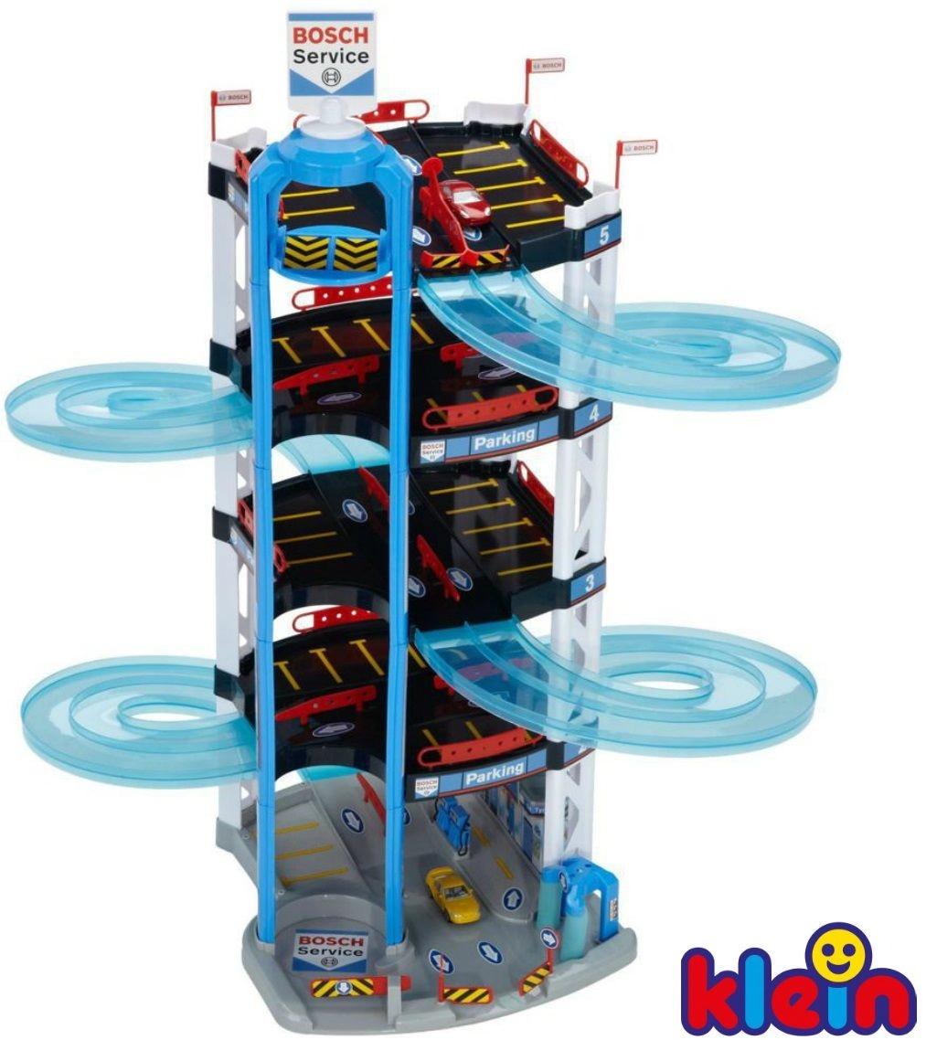 Dit robuuste vijflaags Bosch Service parkeergaragecomplex van het merk Klein is gemaakt voor kleine coureurs. Het biedt halftransparante dubbele spiraalrampen van de hoogste verdieping tot beneden, een handbediende lift om autootjes tussen verdiepingen te verplaatsen en een start/finish voor twee autootjes. Op elke laag zijn voldoende parkeerplekken en op de begane grond bovendien een servicezone met “station” voor realistisch spel.