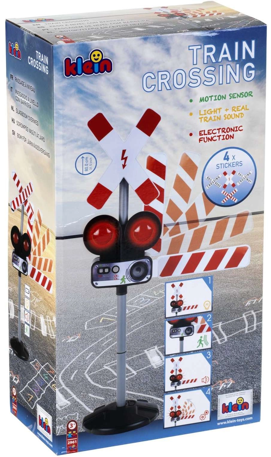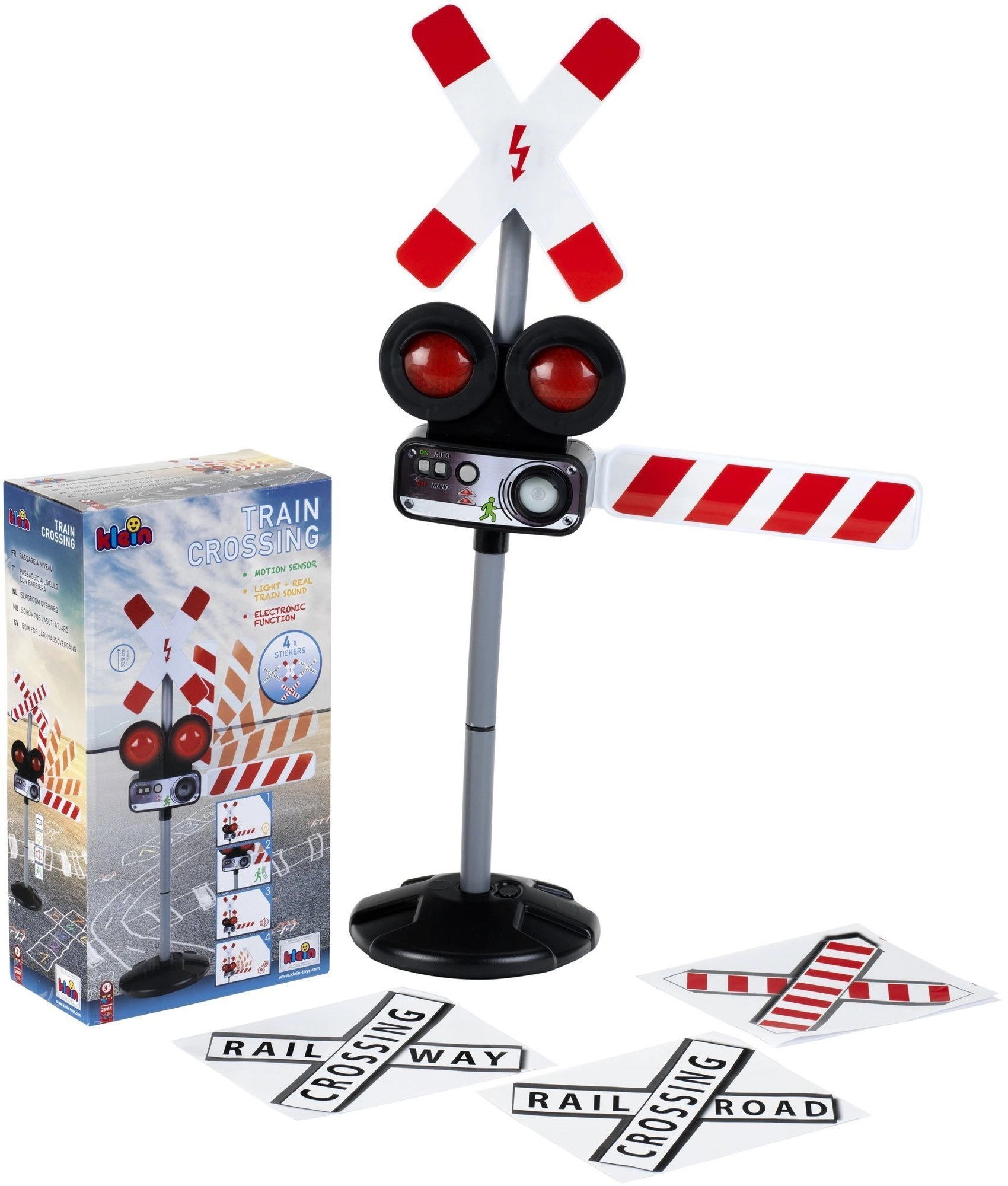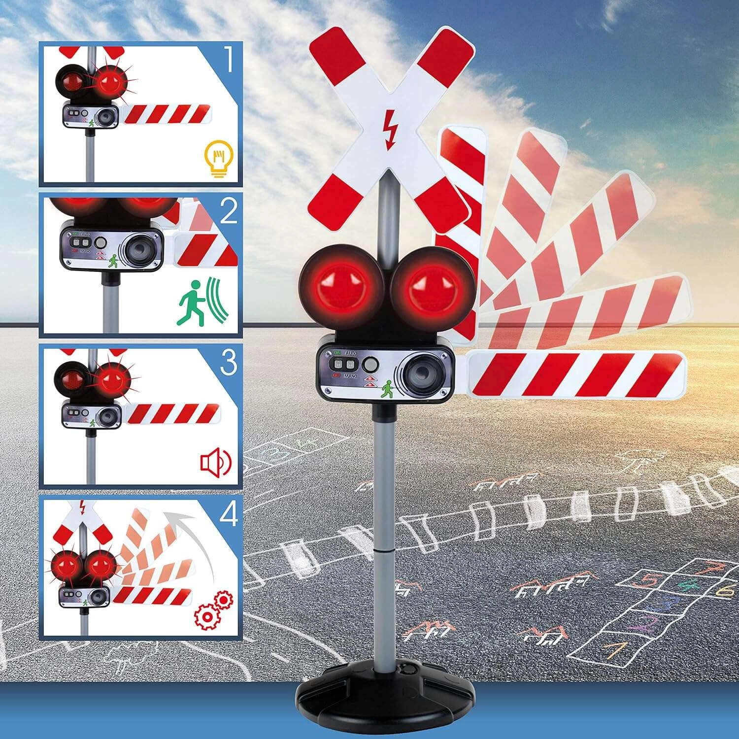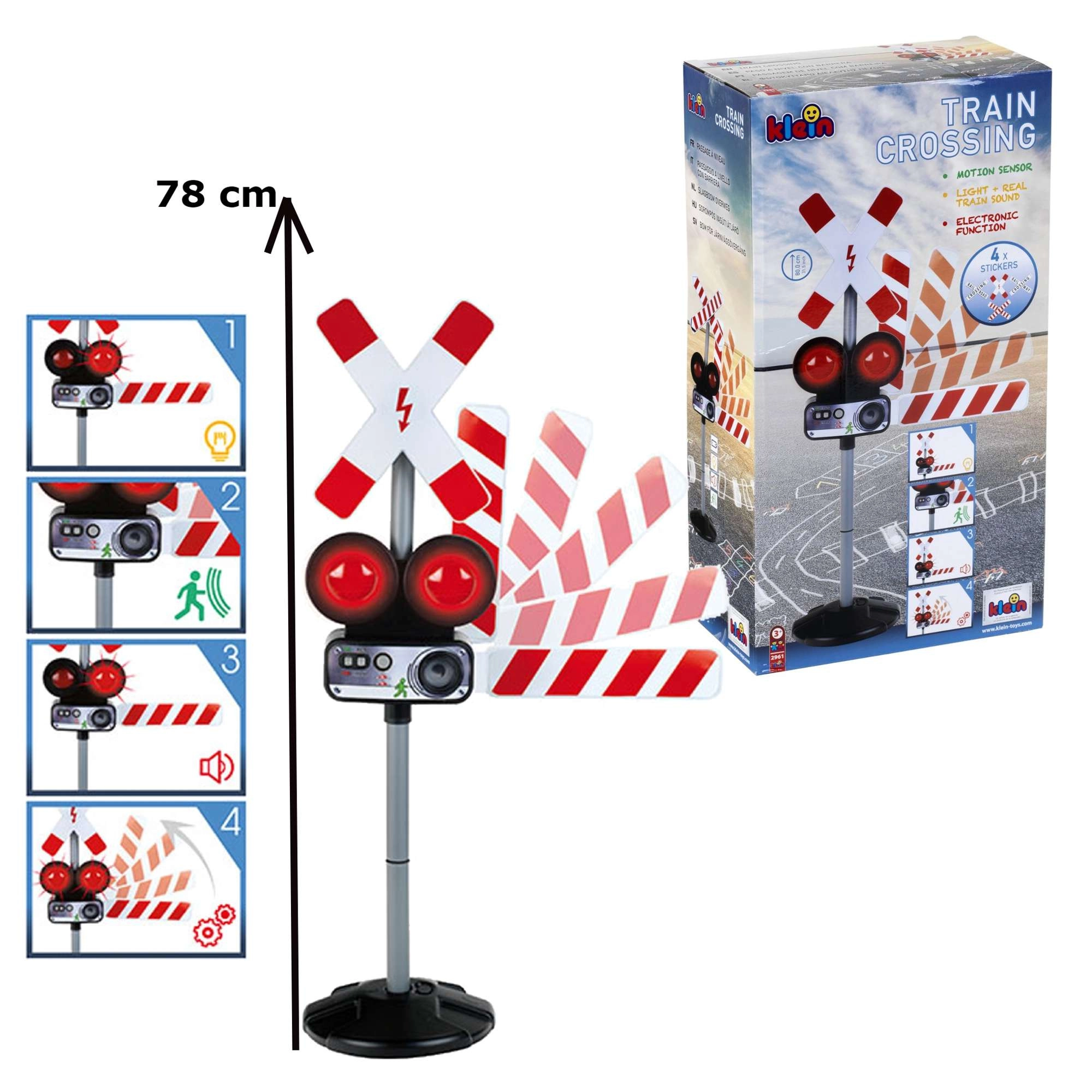 Het interactieve verkeersbord van KLEIN simuleert realistisch een spoorwegovergang – met lichtsignalen, treingeluiden en een bewegende slagboom. Dankzij handmatige bediening en een bewegingssensor biedt het leuk en educatief spel dat veilig gedrag in het verkeer aanleert. Ideaal voor kinderen vanaf 3 jaar.