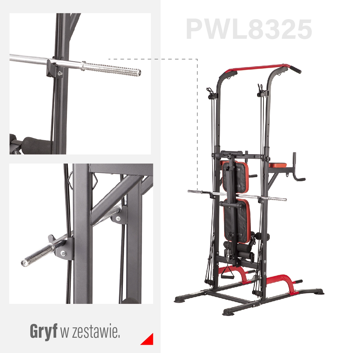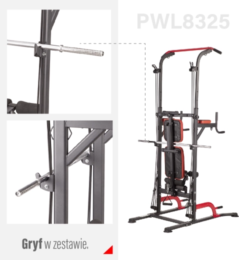 Met het HMS PWL8325-station train je effectief rug, borst, biceps, triceps en buikspieren. De constructie combineert een in hoogte verstelbare optrekstang, dipsteunen met armleuningen voor leg raises, lage steunen voor diepe push-ups en een verstelbare bank voor schuine en horizontale oefeningen met dumbbells. Er is een geïntegreerde haltersteun voor bench press en een stang van 120 cm inbegrepen.